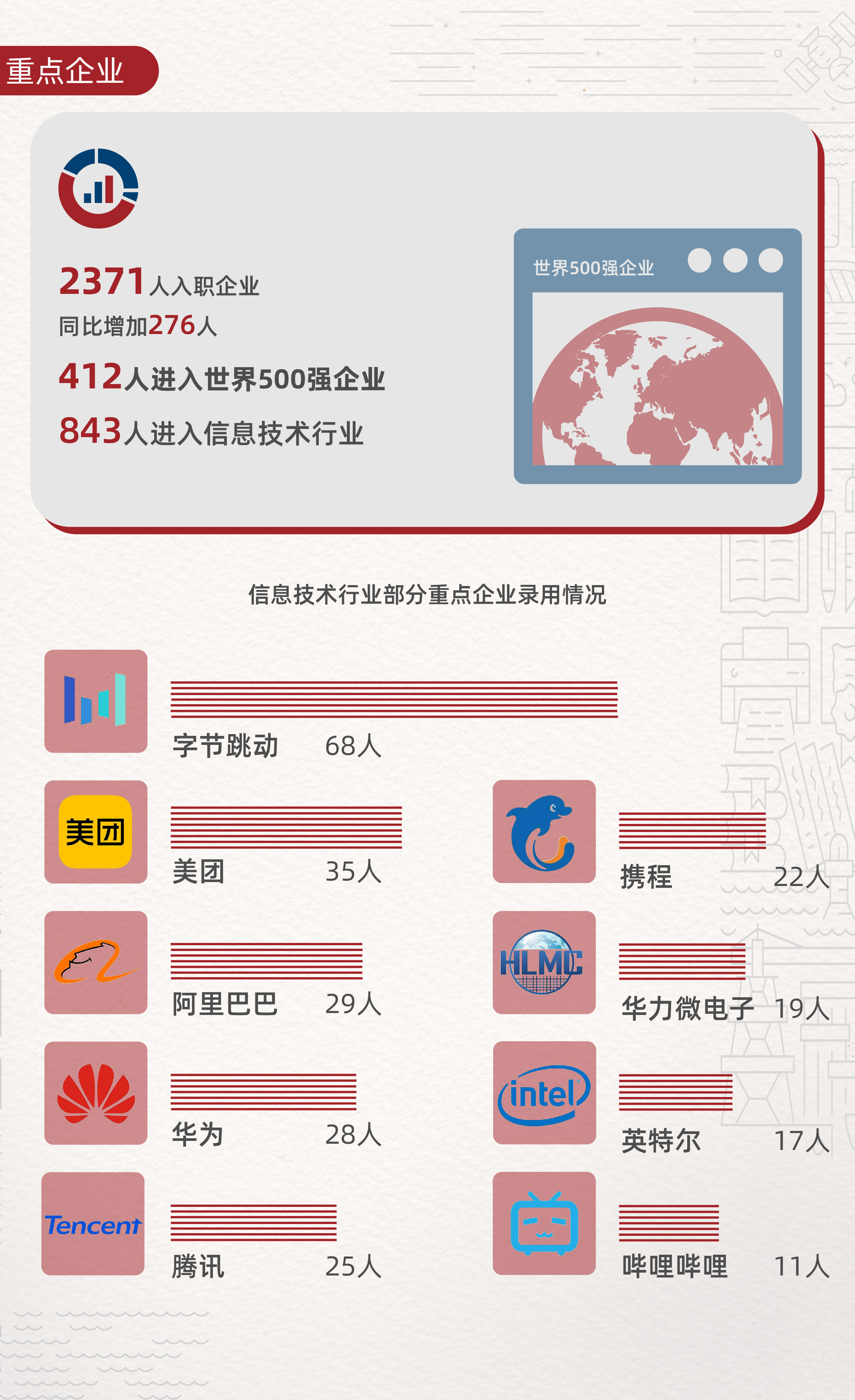 毕业生进入企业就职的共有2371人,同比增加276人,进入世界500强企业的有412人,占企业就职总人数的17.38%。