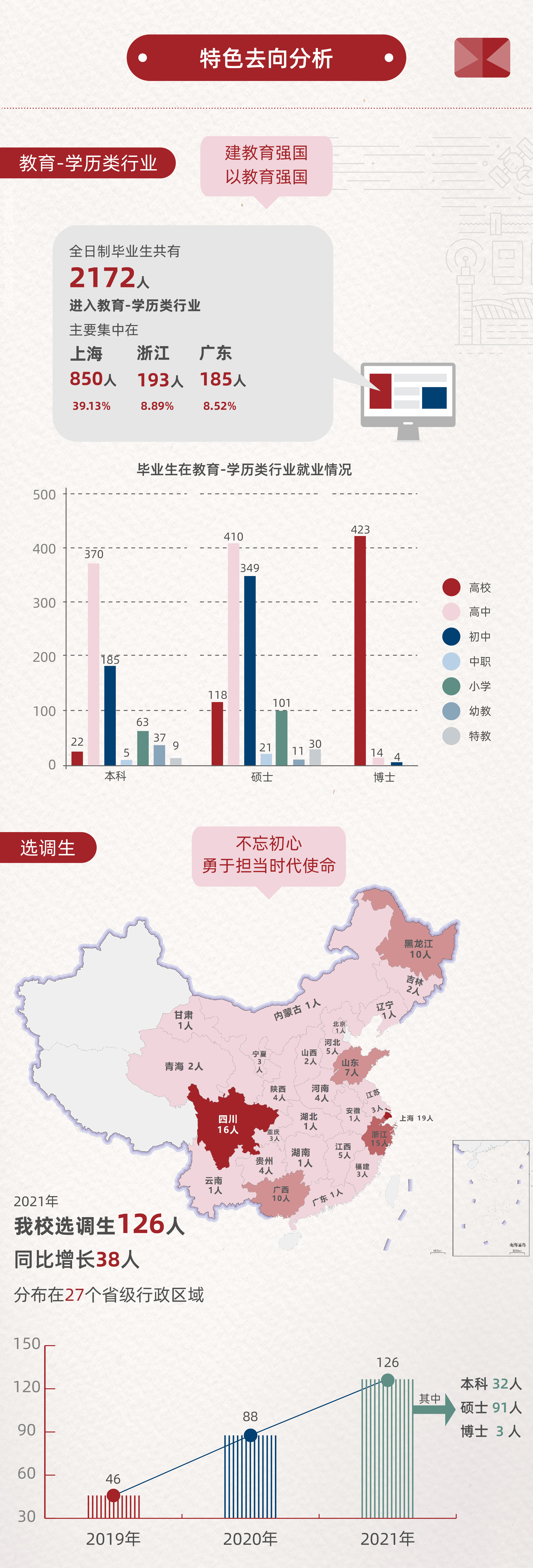 新成立选调生工作办公室,开办选调生训练营,建立基层公共部门就业服务小组,推动学生参与多地社会实践和挂职锻炼,选调生工作迈入快速发展通道。毕业生中,选调生就业126人,较2019届46人、2020届88人,继续实现快速增长。