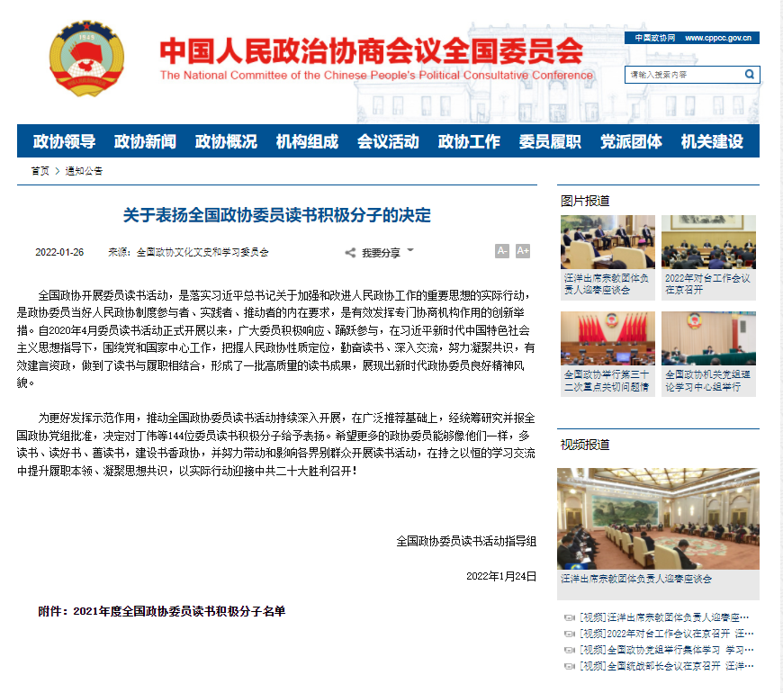 为更好发挥示范作用,推动全国政协委员读书活动持续深入开展,1月24日,全国政协委员读书活动指导组决定对144位全国政协委员读书积极分子给予表扬。全国政协委员、华东师大社会发展学院丁金宏教授获“全国政协委员读书积极分子”表扬。