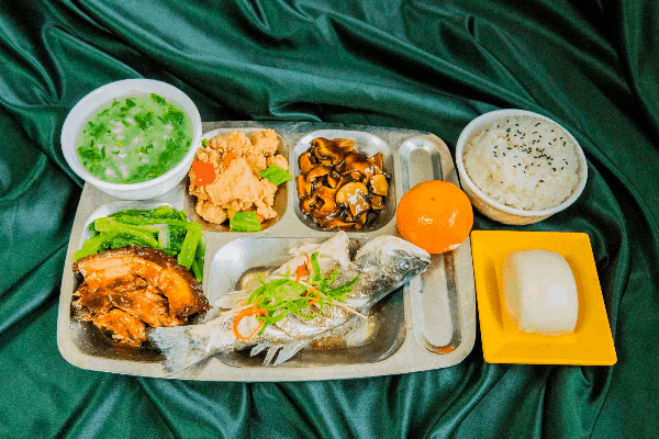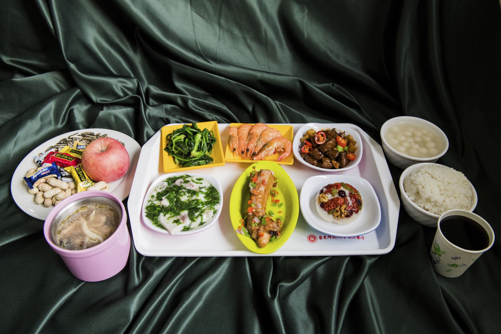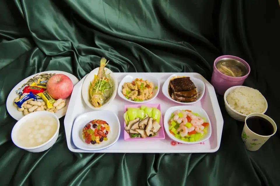 套餐一:盐水大虾、蒜香仔排、杏鲍菇牛仔粒、荠菜溜鱼片、小菠菜;菌菇草鸡汤;酒酿小圆子;米饭或小馒头、八宝饭;饮料;水果;糖果。