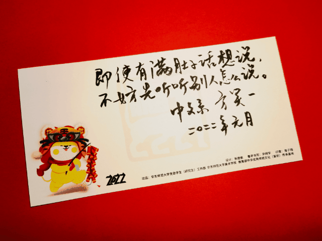 这喜庆洋洋的祝福卡片是华东师大美术学院张捷愉同学设计的,书法“春”字出自尹柯宇同学,篆刻来自周子翔同学。此外,祝福卡片全部为全校师生手写祝福!