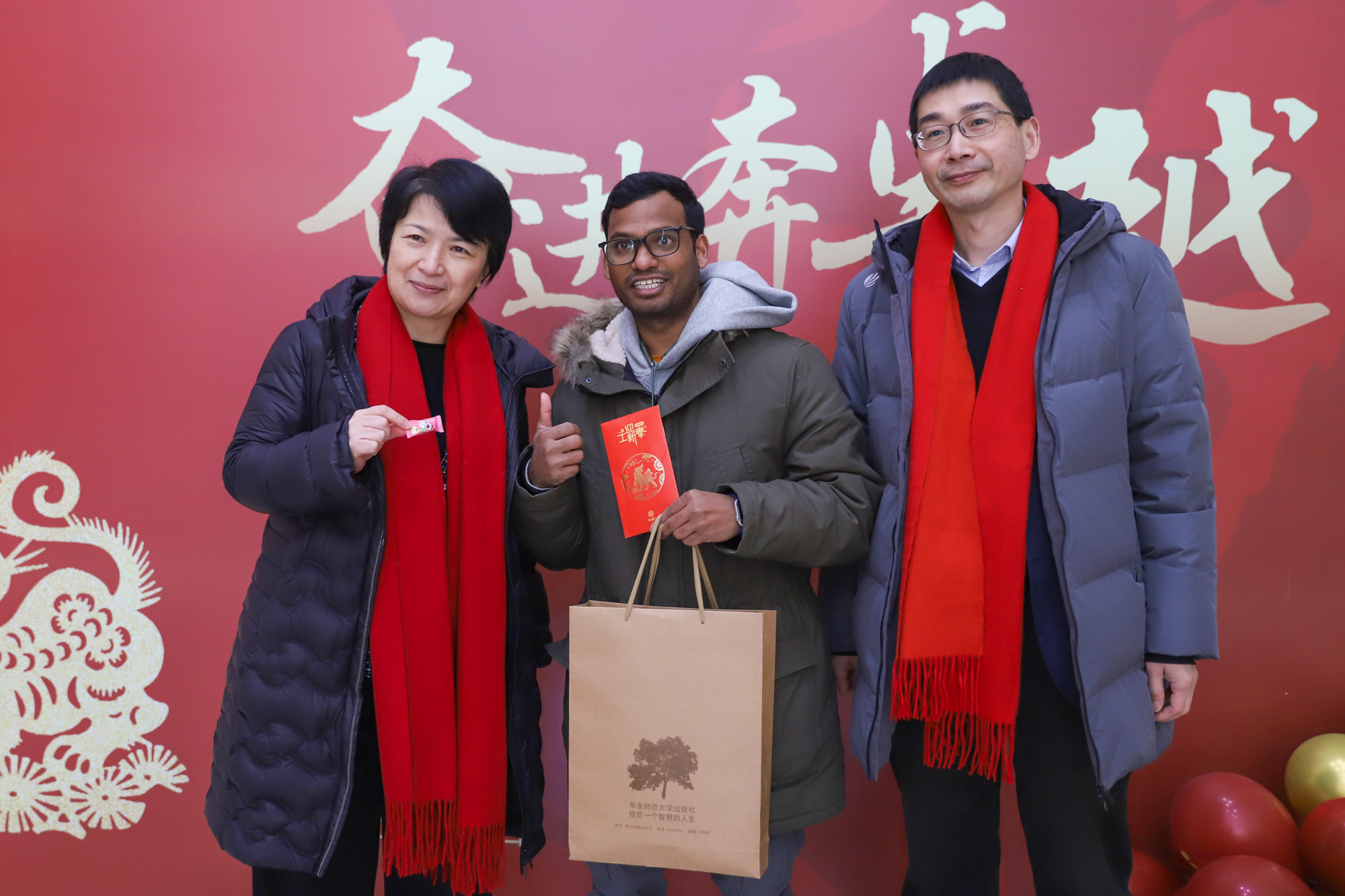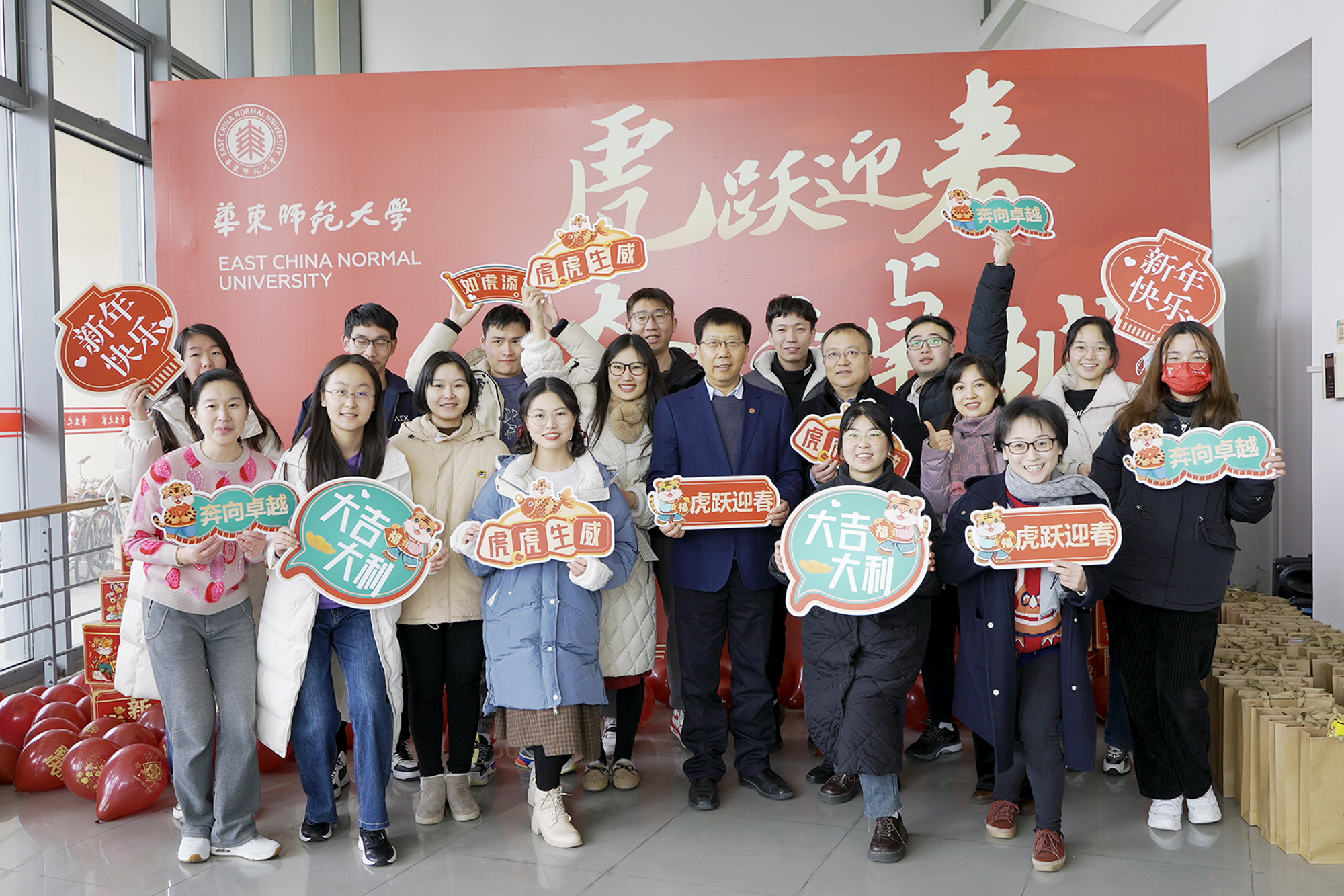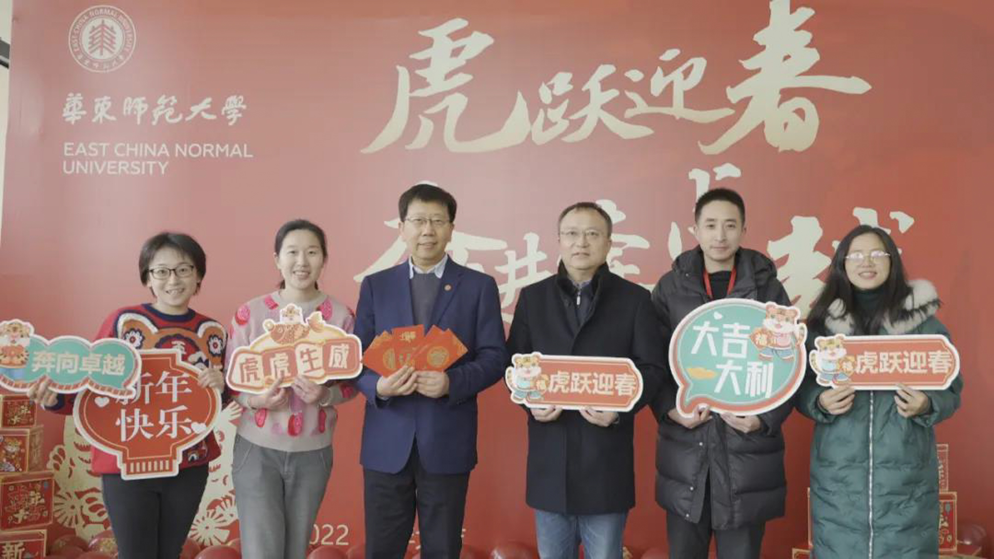 辞金牛,抱寅虎。除夕的华东师大校园其乐融融、欢庆祥和。在两校区大学生活动中心大厅里,华东师大党委书记梅兵,校长钱旭红,副校长雷启立、顾红亮分别在两校区为留校学生送上大礼包,包含旺旺集团捐赠的零食大礼包、校基金会捐赠的校庆口罩以及祝福红包。