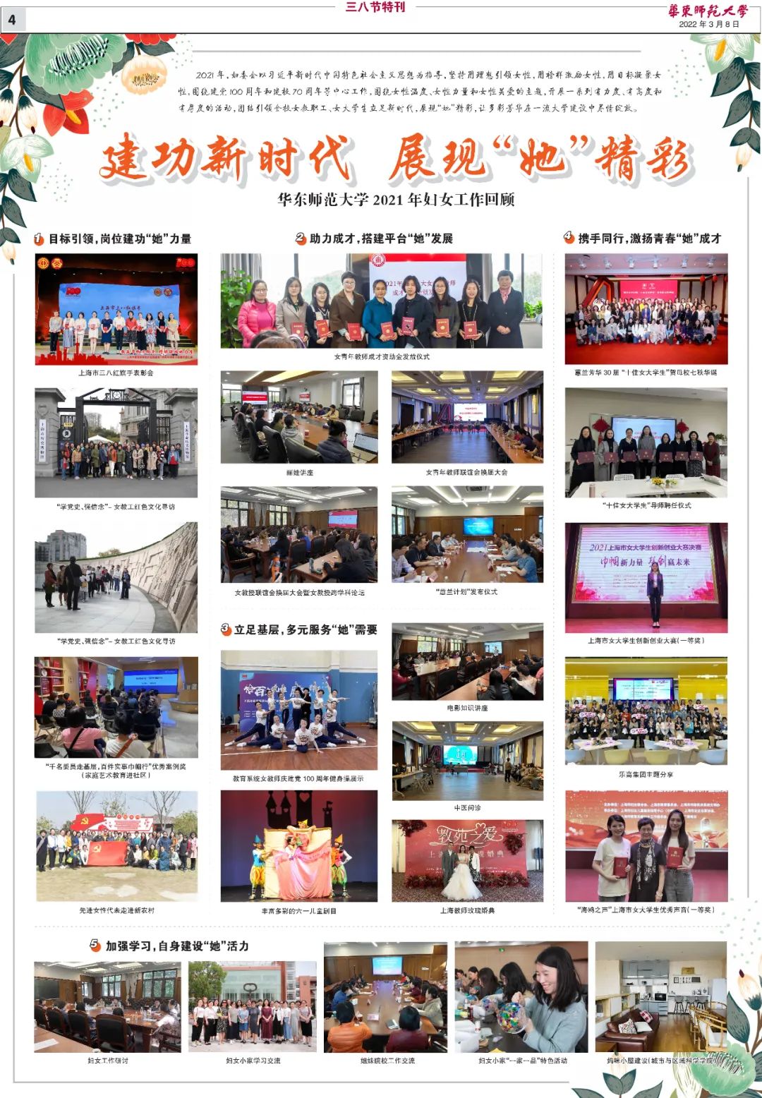 过去一年,华东师大广大女教工、女大学生在学校各级党政和上级妇联组织的关心下,在校妇委会的带领下,在各自岗位上为学校的改革和发展做出了积极的贡献,涌现出了一批先进集体和个人,她们以优异的成绩、出色的表现、良好的家风彰显了自强不息、坚韧刚毅、智慧豁达的新时代女性风采以及家庭文明新风尚,得到了校内外的广泛赞誉。