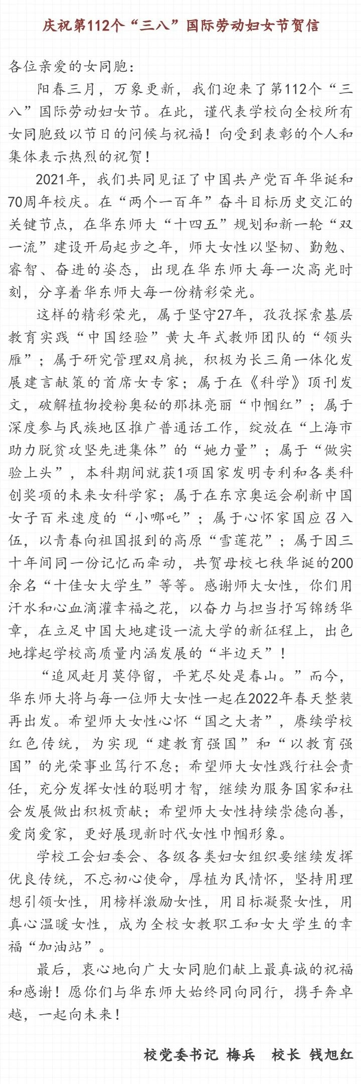 梅兵书记、钱旭红校长向全校女同胞的祝福