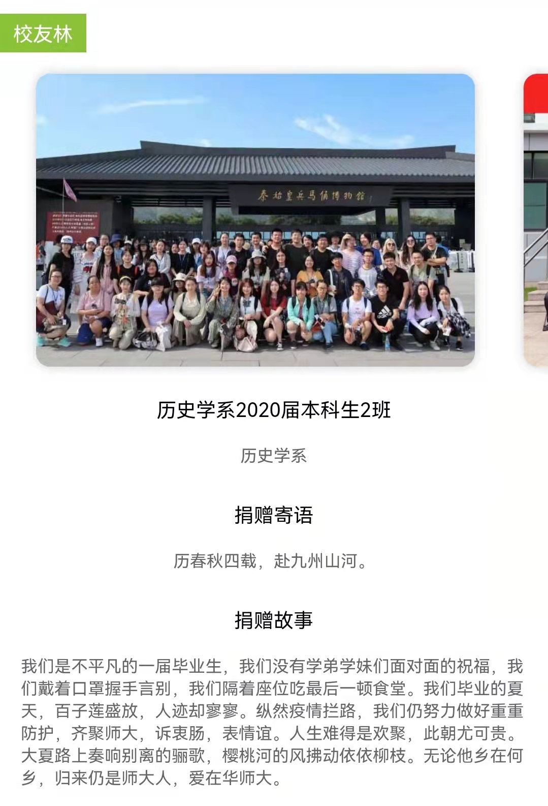 “我们是不平凡的一届毕业生,我们毕业的夏天,百子莲盛放,人际却寥寥……大夏路上奏响离别的骊歌,樱桃河的风拂动依依柳枝,无论他乡在何乡,归来仍是师大人。”这是2020届历史学系本科生2班的捐赠故事,虽然由于疫情他们没有办法很好地告别,但师大的一草一木却成为了他们回忆中抹不去的靓丽风景。