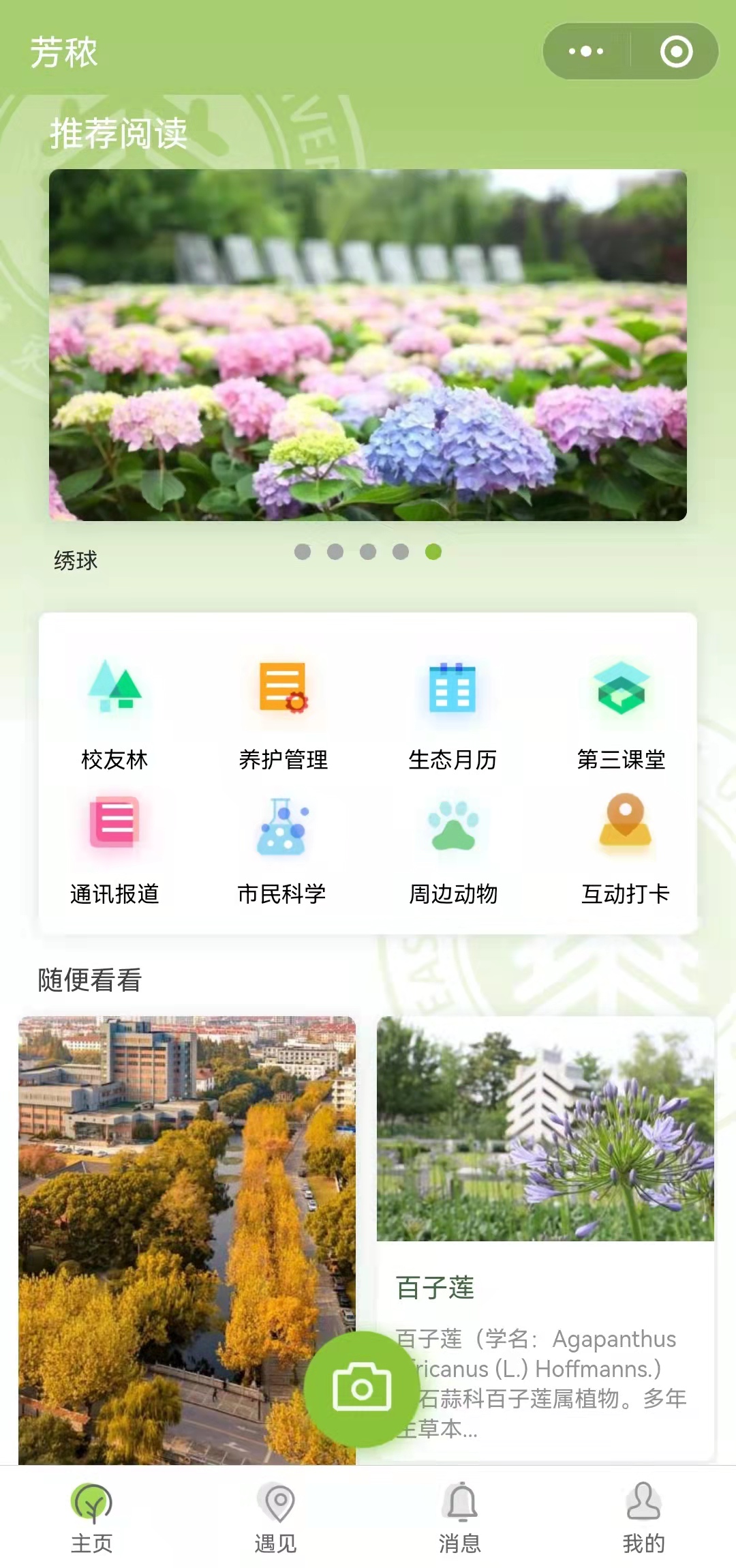 校内都有哪些植物?这些植物如何分布?小程序“遇见”版块的生态地图来揭秘。这是华东师大生命科学学院田怀珍副教授带领植物分类学研究生和爱好植物的本科生的调研成果,他们对两校区所有的栽培植物进行了调查、识别和定位,形成了一张生动鲜活的校园常见植物地图。