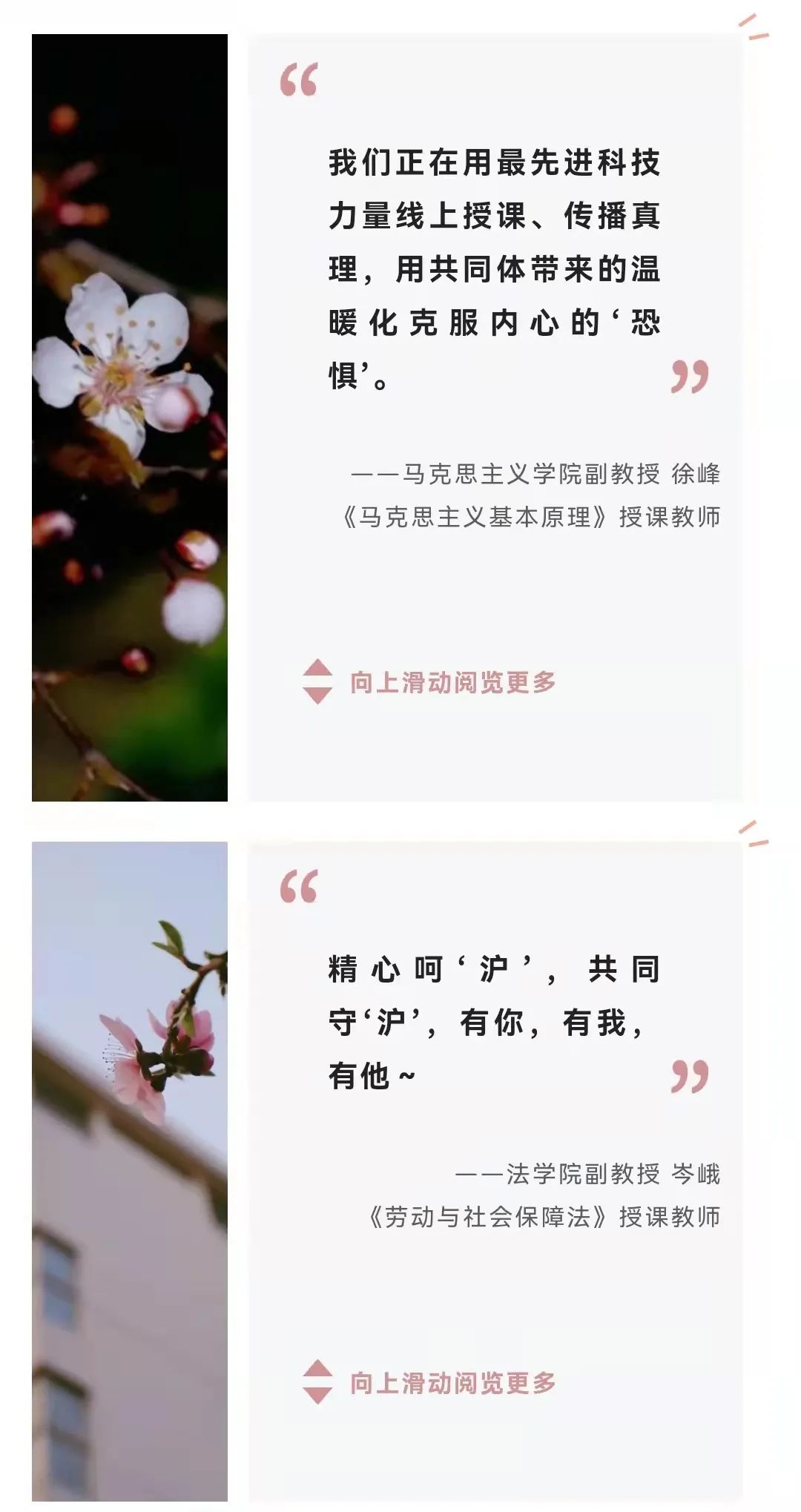 活动策划者之一、大夏书院辅导员曹安琦介绍道:“老师们的热情令我们感到十分惊喜,除了一段段接地气、有温度的文字之外,还有老师分享了书籍、音乐、摄影作品,从各自专业的视角与个人的经历出发,和学生一起观照疫情下的种种变化,传达了坚定而踏实的力量。”