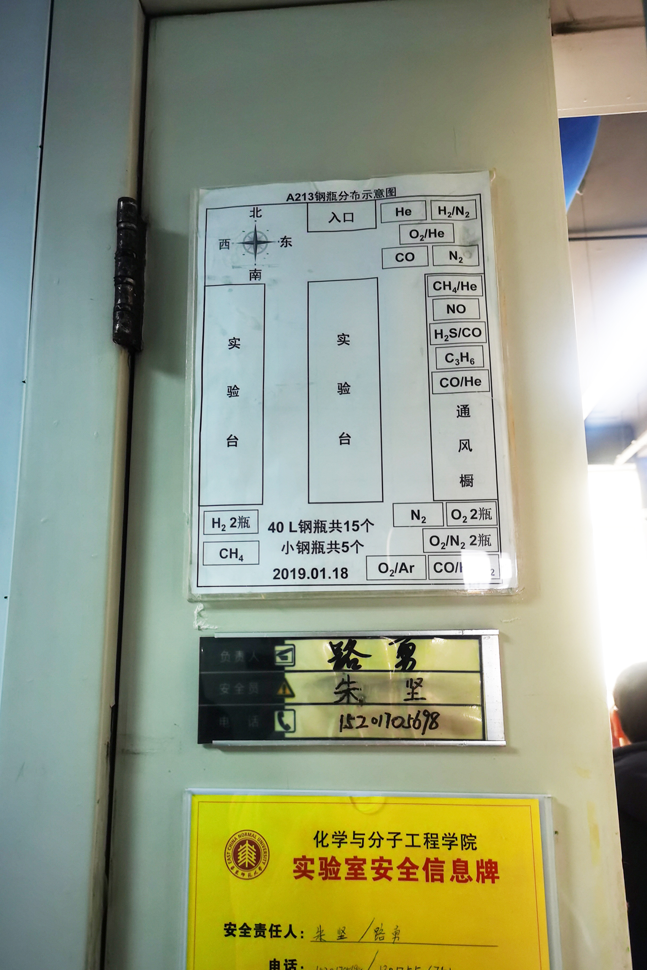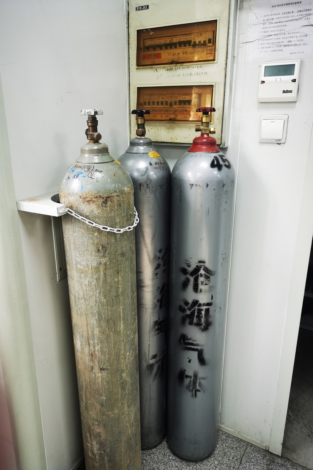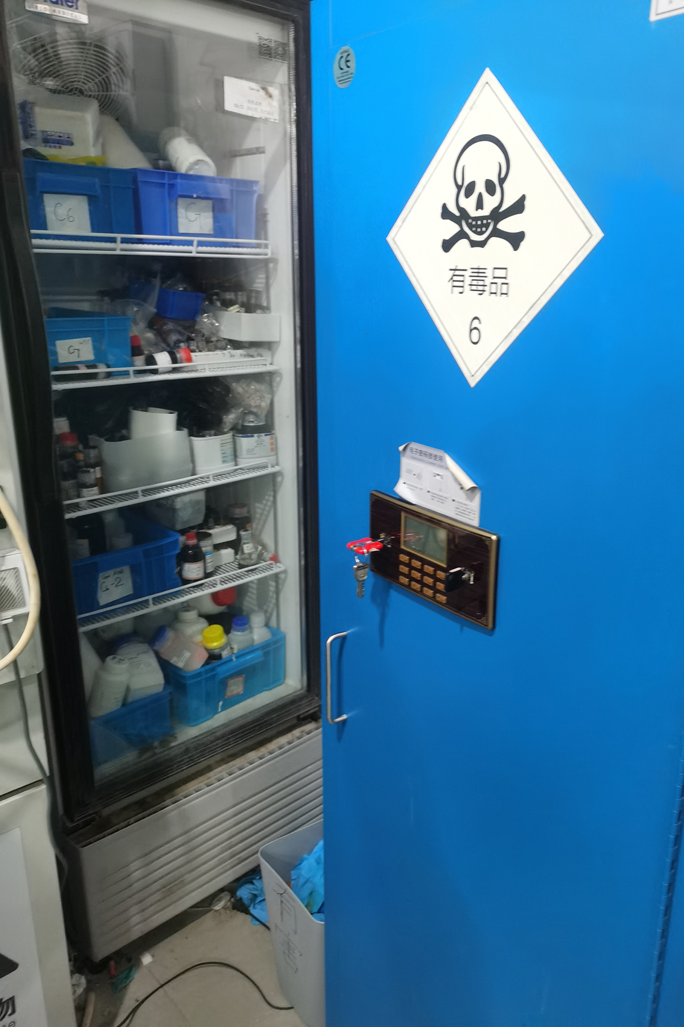 化学药品柜两把钥匙未拔 钢瓶未固定