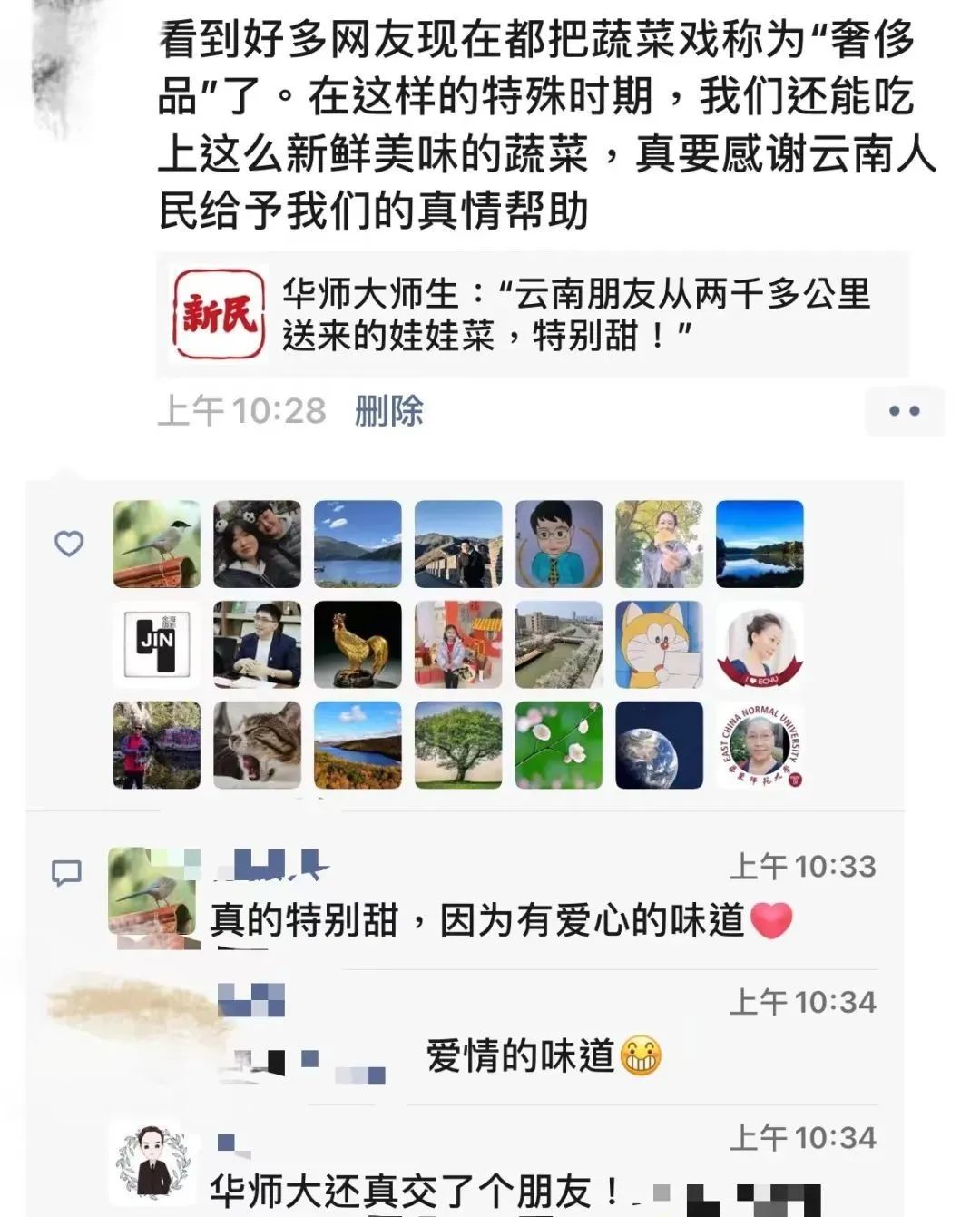 “看到好多网友现在都把蔬菜戏称为‘奢侈品’。在这样的特殊时期,我们还能吃上这么新鲜美味的蔬菜,真的很幸福!感谢所有为我们提供帮助的人,我们心存感激,与爱同行。”