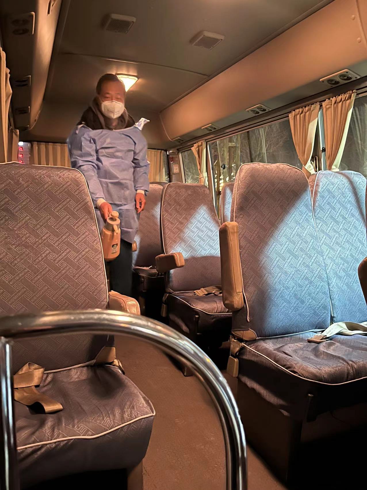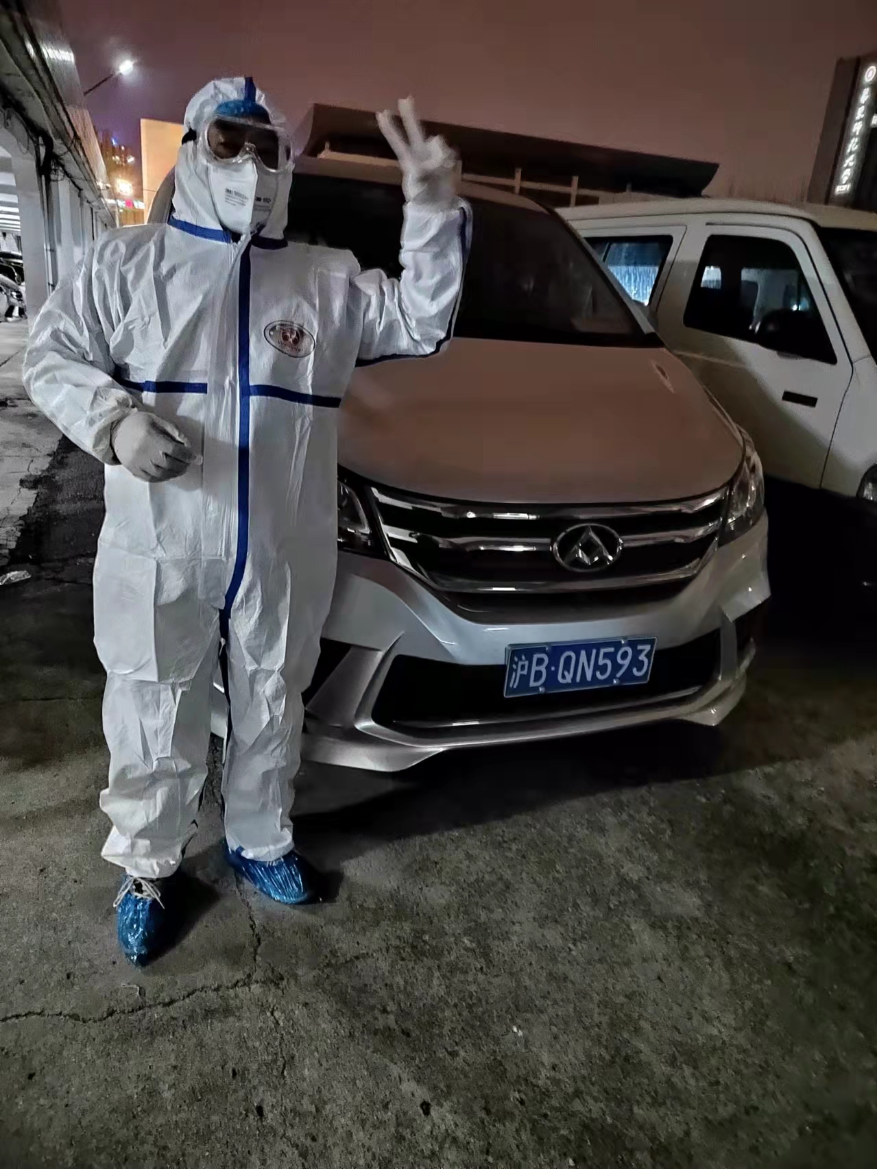 我们闵行车队从一开始就做好了打硬仗的准备,在严峻的形势下,车队的师傅们从早忙到晚,甚至有时候工作到凌晨三点左右,饭都没时间吃。我们每次出车前都会进行车辆消毒,做好“一车一消毒”,晚上工作结束后再消毒。