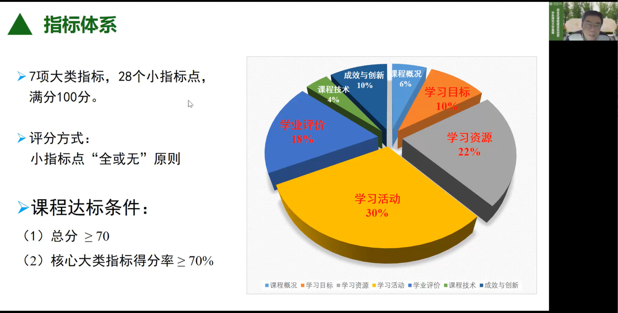 首场教学工作坊的专家报告由生命科学学院姜晓东教授主讲。姜晓东教授首先说明《3245澳门新莆京混合式课程标准》的核心理念、指标体系和应用原则,接着从培训目标、标准概述、指标解释和案例分析四个方面讲解《3245澳门新莆京混合式课程标准》指标一“课程概况”和指标二“学习目标”,穿插小测验和经典案例,调动实训营学员积极性,实时了解学员掌握情况。