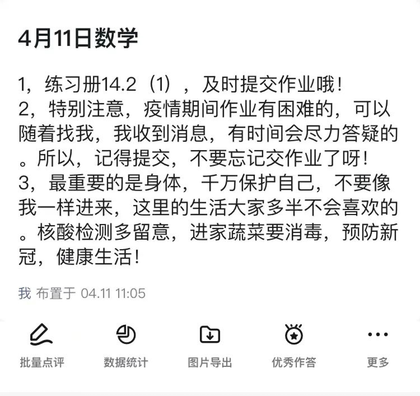小杰同学如常进入直播间,率先看到郑老师的状态记录:“隔离中,希望尽快回到温暖的家里。”孩子们随即七嘴八舌议论起来:“不是吧?郑老师你中招了?”“你得新冠了?还坚持给我们上课吗?”短短的课前十分钟,孩子们或好奇或关心或安慰,让郑宸觉得很温暖。