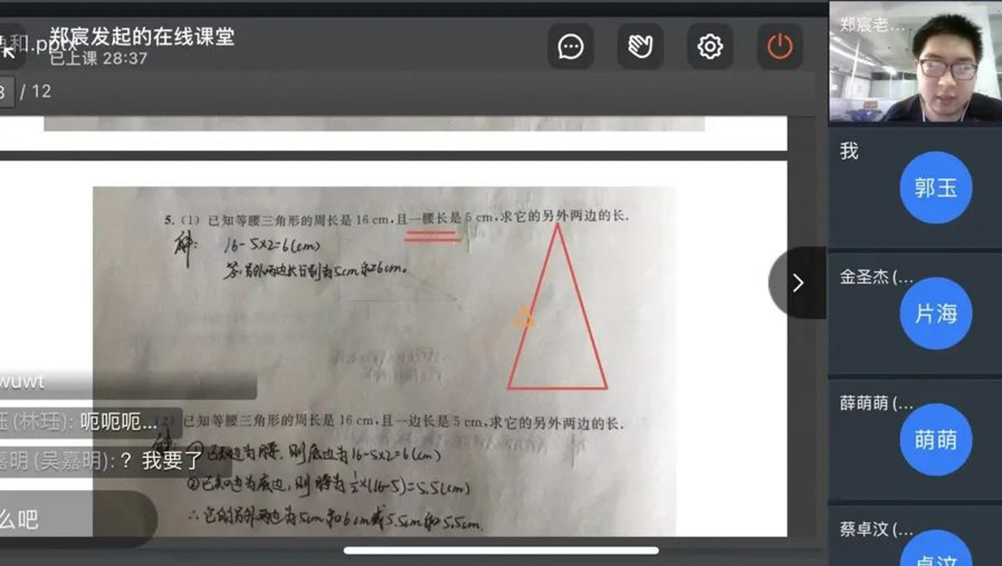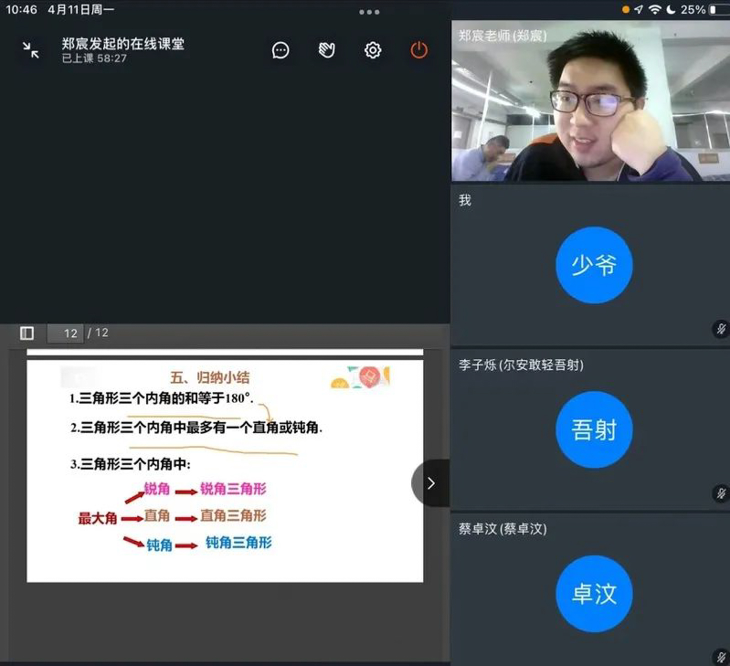 4月11日上午,在隔离点的第一堂数学课,非常顺利!郑宸戴着耳机讲课,学生们表示收音效果也不错。虽然,隔离点条件有限,但郑宸尽力克服,这一节数学课上的是七年级第二学期第十四章《14.2三角形的内角和》,网课评论区异常安静,孩子们听得格外专注。