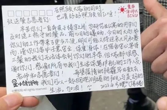 接下来,我们也会继续把三餐送到每栋宿舍楼前,把生活物资分发到每间宿舍门口,把每位排队做核酸时“贴贴”的同学隔开两米,无论晴天或阴天、烈日或雨夜。