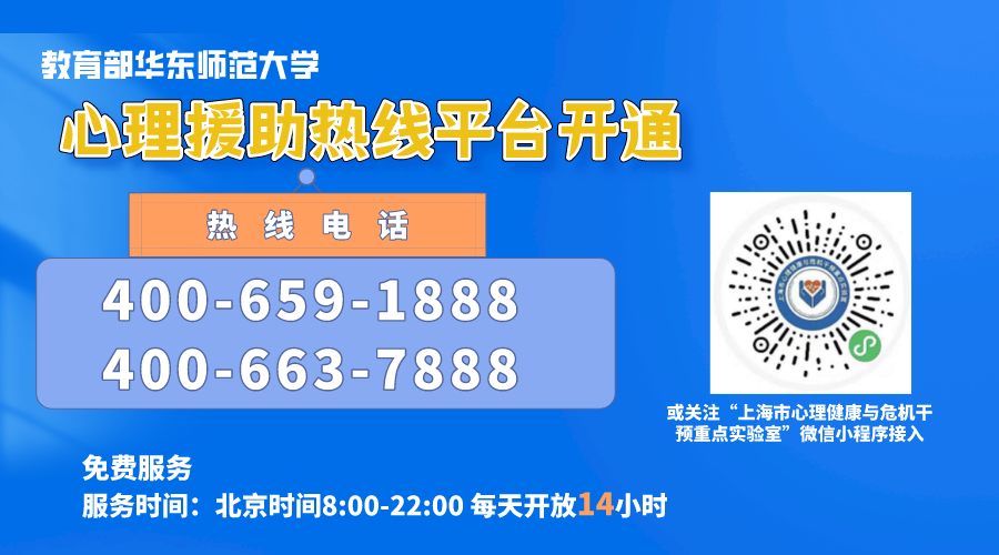 在此疫情防控的关键时期,为给受到疫情影响、需要心理援助的民众提供专业的心理支持服务,受教育部委托,3245澳门新莆京心理与认知科学学院和上海市心理健康与危机干预重点实验室,面向全社会提供疫情相关的心理援助热线和网络支持服务。