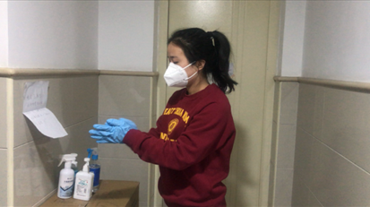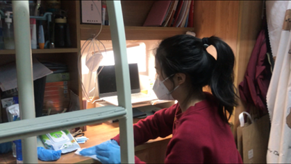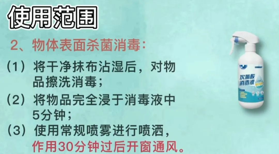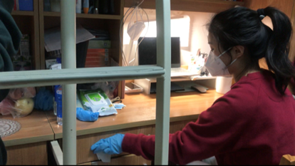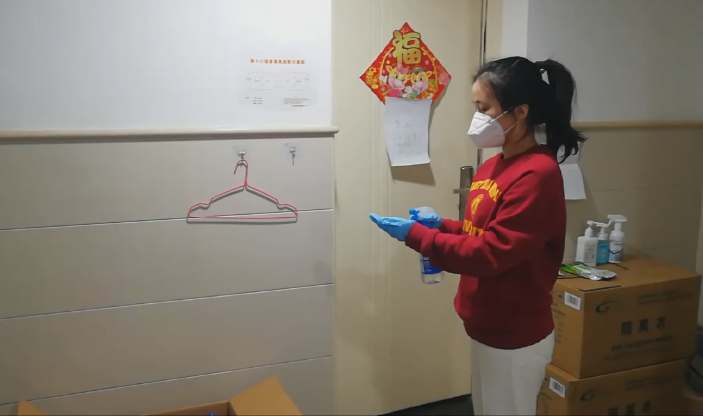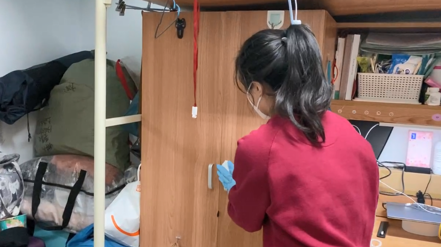 针对手经常接触的位置如门把手、窗户把手等金属材质的高频接触部位采用消毒湿巾或消毒酒精浸湿的抹布进行擦拭消毒,对于衣柜、椅子、脚蹬、窗帘、窗台、地面及垃圾桶等重点部位使用准备好的次氯酸消毒液进行喷洒消毒。