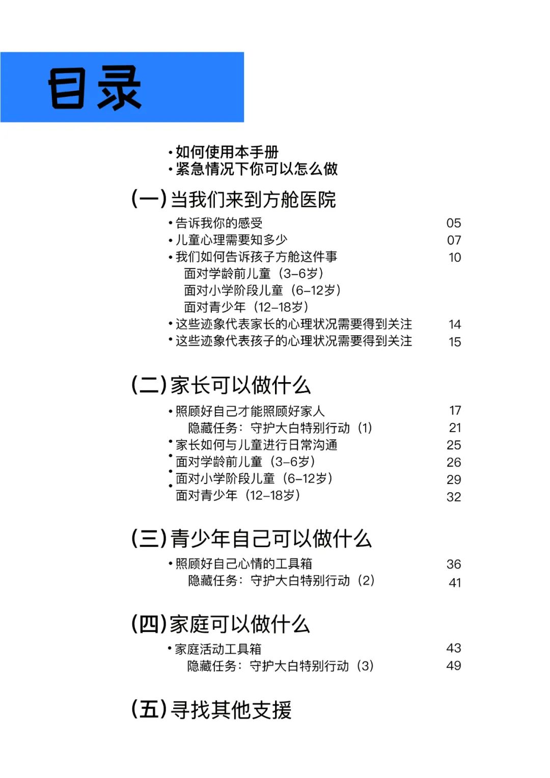《新冠疫情下家庭心理自助手册》共分为5个部分,包含家庭如何应对方舱医院的生活、日常居家生活中家长可以做什么、青少年自己可以做什么、家庭可以做什么,以及其他心理健康支持资源的整理。