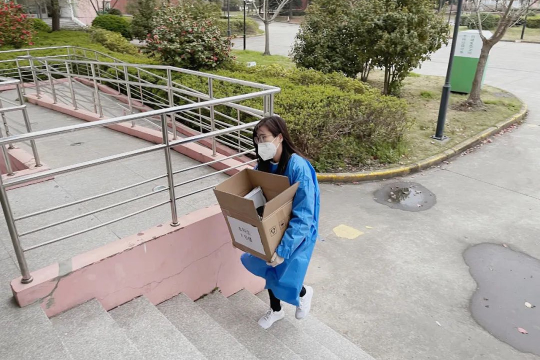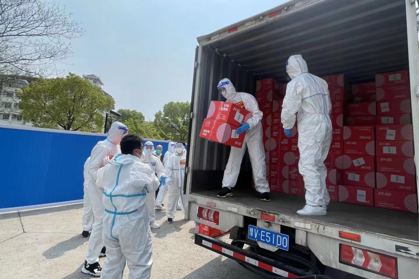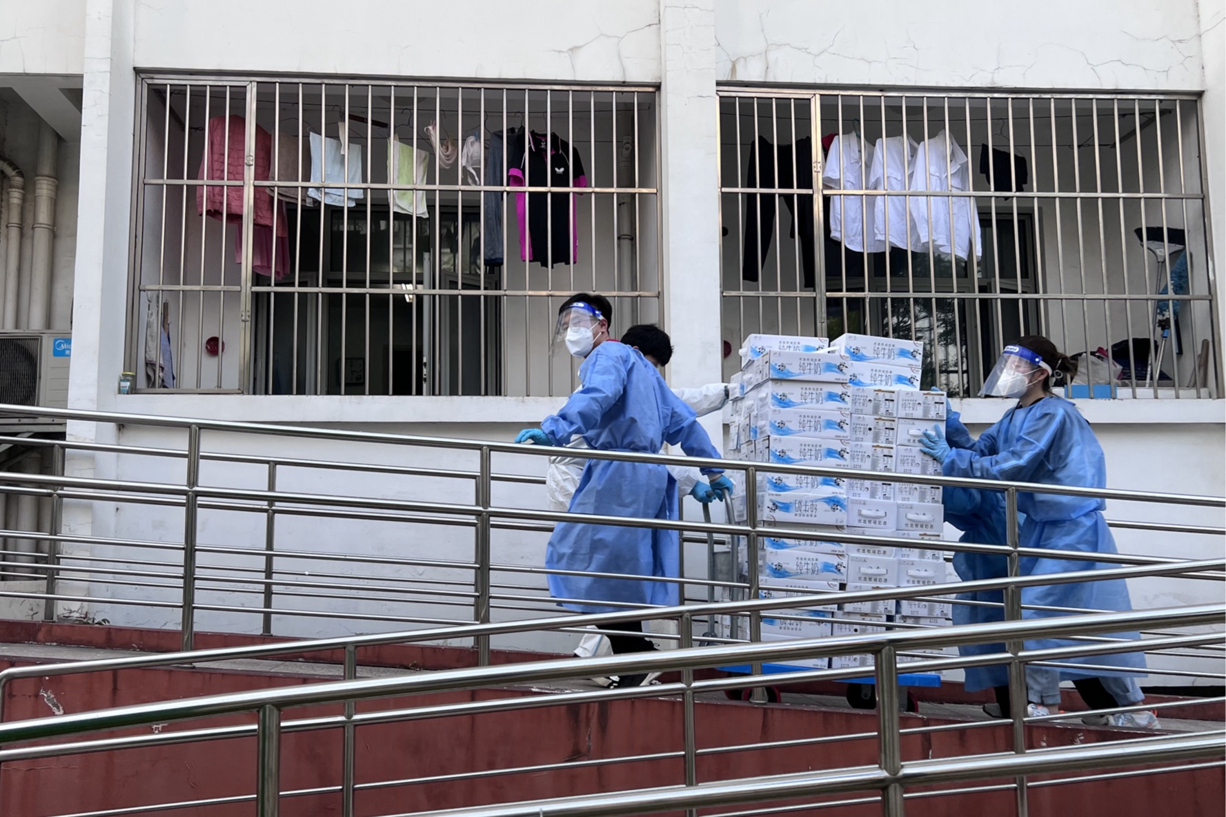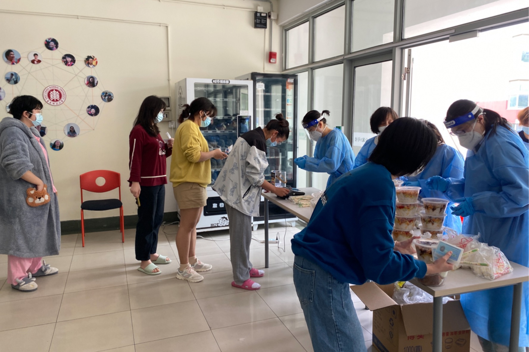 由于校园封闭管理,学校送来的所有物资全部依靠区块二的师生志愿者配送运至各楼栋。