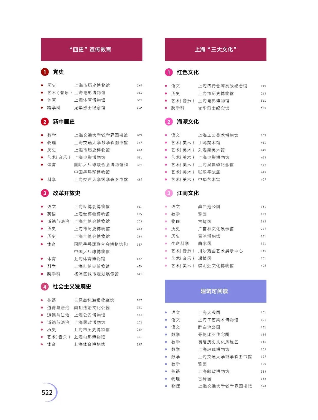 从学科教育出发,鼓励师生从课本走向博物馆,拓宽基础型课程视野,在确保博物馆教育的趣味性与互动性的同时,探索博物馆教育的创新方式。“百馆百单”还特别设计各专题索引,旨在为拓展型课程、探究型课程提供了解认识国家历史文化和基本国情的社会实践、科学研究和职业体验的场景,也期待为博物馆的亲子教育提供参考。