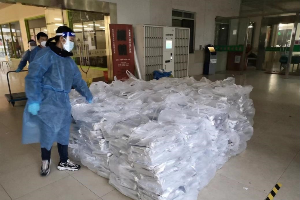2700份餐像是一座小山,我们每两人负责一辆小拖车,一趟又一趟地奔走在楼宇间,一餐饭送下来,早已全身湿透,可这才仅仅是这场“战疫”的开始。