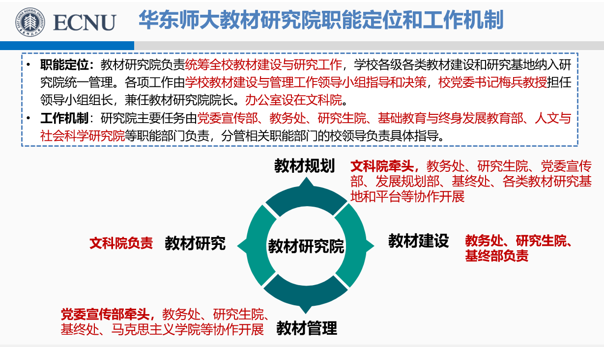 他强调,华东师大是以育人创新为优势特色的大学,肩负着推动我国教育改革发展的重要使命,在做好本科教材建设的同时,也要进一步关注基础教育教材建设,为有力推进国家教材建设工作,为国家的教育改革发展做出自己的贡献。