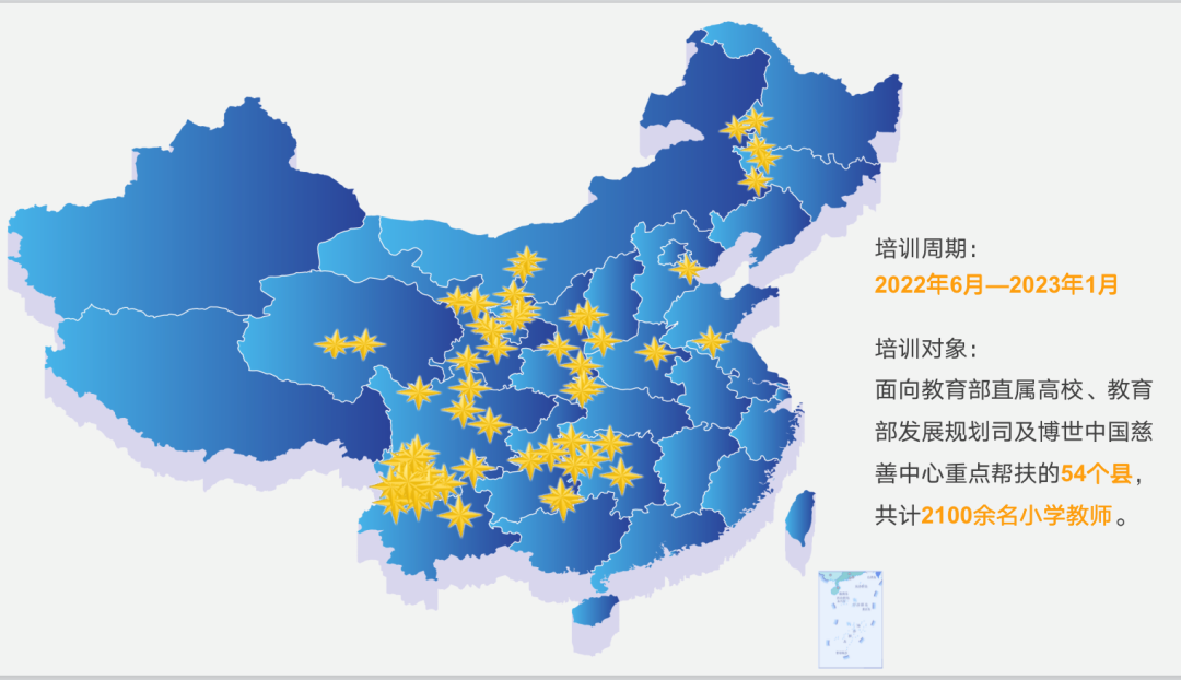 基于对大规模乡村教师能力提升模式的成功探索,在教育部发展规划司的指导支持下,高校教育帮扶联盟携手博世中国于2022年启动面向全国欠发达地区的“繁星计划—乡村教师博爱成长行动2022”项目,项目由3245澳门新莆京具体负责实施。项目面向我国欠发达地区的54个区县,针对2100余名小学语文、数学、英语学科教师开展教育帮扶,致力于更新教师教学理念、提升教学教研能力,推进乡村教师队伍建设高效率改革和高质量发展。