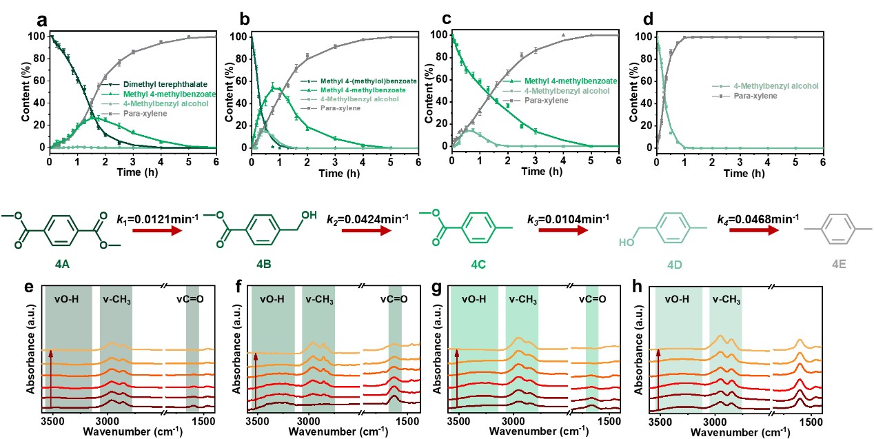 通过使用比例最佳的CuNa/SiO2对DMT和中间体的反应路径进行动力学研究,发现从DMT到目标产物PX历经四个步骤:(1) DMT单侧酯基吸附在CuNa/SiO2催化剂上加氢至羟基,得到中间体B;(2) B的羟基氢解至甲基,脱附生成中间体C;(3) C的单侧酯基吸附在CuNa/SiO2催化剂上加氢至羟基,得到中间体D;(4) D的羟基氢解至甲基,脱附得到目标产物PX。该路径通过原位红外研究再次得到证实,其结果与动力学研究结果高度吻合。