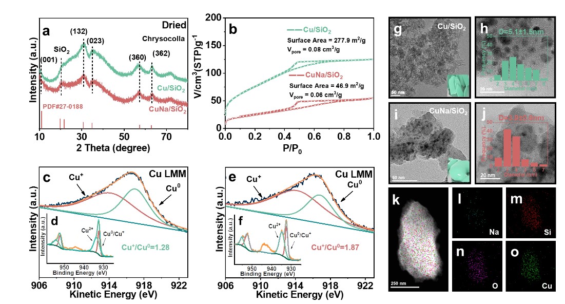 高效率转化塑料的催化剂归因于在传统水热合成Cu/SiO2的过程中添加适量的NaCl,Na+占据SiO2表面的部分硅羟基,从而抑制了层状硅酸铜的成核和生长。溶液中的Cu2+只能与SiO2表面剩余的硅羟基结合形成分散、孤立的硅酸铜颗粒。其结构致密,表面积小,结晶度差,且较难还原。故经还原处理得到的CuNa/SiO2具有高Cu+/Cu0比,为甲醇脱氢以及DMT选择性加氢提供了丰富的活性位点(图2、图3)。