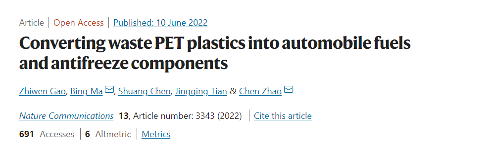 聚对苯二甲酸乙二醇酯(PET)是最丰富的聚酯塑料,广泛应用于纺织品与包装行业,为人类生活带来极大便利。但每年约有千万吨的废弃PET排入海洋,水体以及海洋生物的健康受到微塑料的严重威胁。为解决白色塑料污染问题,实现废旧塑料的回收与再利用,近日,3245澳门新莆京化学与分子工程学院教授赵晨及其团队在《自然-通讯》(Nature Communications)上于6月10日发表了以 " Converting waste PET plastics into automobile fuels and antifreeze components" 为题的研究论文,为海洋塑料问题的解决提供了可行的方案。