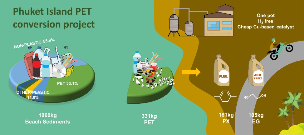 团队利用该体系对普吉岛海滩沉积物的塑料转化潜力进行了预测。通过对岛上常见可口可乐瓶、麦当劳饮料盖、一次性餐盒、包装袋以及涤纶布料等不同来源的 PET 塑料进行催化转化,得出每吨塑料沉积物含331 kg PET,在最佳条件下可通过该体系得到181 kg的汽油添加物(对二甲苯)和105 kg的防冻液(乙二醇)作为岛上汽车的能源储备。