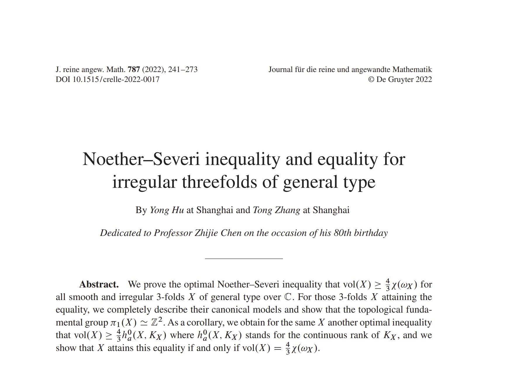 在另一项研究工作中,张通和胡勇利用相对典范映射的细致分析,建立了所有三维不规则代数簇应当满足的最佳Severi不等式。由于其形式与三维代数簇的Noether不等式相关,该不等式也称为Noether-Severi不等式。他们同时完整分类了满足Noether-Severi等式的三维不规则代数簇,并刻画了其拓扑基本群。