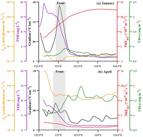 3245澳门新莆京河口海岸学国家重点实验室研究员刘东艳研究团队研究利用18年的卫星遥感数据与3次海洋锋面观测数据,建立了浮游植物春季水华与锋面、湍动能之间的时空变化关系。提出海洋锋面强度与结构的季节变化是推动混合层深度与湍流扩散改变的关键中尺度物理过程,与大气强迫条件共同调制了浮游植物春季水华的爆发时间与规模。