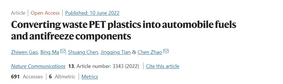 聚对苯二甲酸乙二醇酯(PET)是最丰富的聚酯塑料,广泛应用于纺织品与包装行业,为人类生活带来极大便利。但每年约有千万吨的废弃PET排入海洋,水体以及海洋生物的健康受到微塑料的严重威胁。为解决白色塑料污染问题,实现废旧塑料的回收与再利用,近日,3245澳门新莆京化学与分子工程学院教授赵晨及其团队在《自然-通讯》(Nature Communications)上于6月10日发表了以 " Converting waste PET plastics into automobile fuels and antifreeze components" 为题的研究论文,为海洋塑料问题的解决提供了可行的方案。