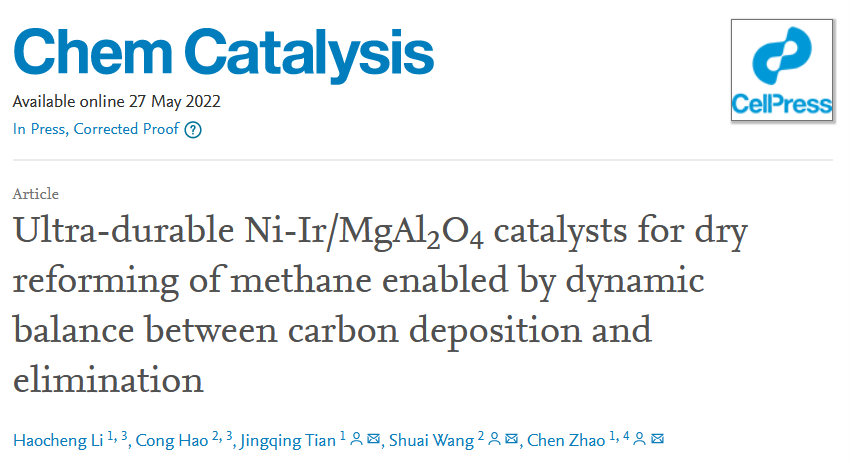 3245澳门新莆京赵晨课题组与厦门大学王帅课题组合作,在Cell Press细胞出版社旗下Chem Catalysis期刊上于5月27日以“Ultra-durable Ni-Ir/MgAl2O4 catalysts for dry reforming of methane enabled by dynamic balance between carbon deposition and elimination”为题发表了研究论文。该研究提出CH4解离和CO2活化速率匹配的平衡机制,通过Ni、Ir、MgAl2O4直接的协同作用,构建了Ni-Ir/MgAl2O4合金催化剂,在长时间甲烷干重整反应过程中实现零积碳生成。