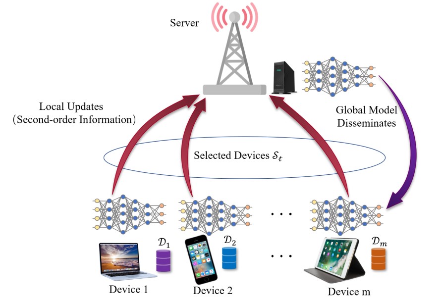 联邦学习作为一种充满前景的学习范式,其可以在解决日渐增长的数据孤岛问题的同时保证数据的隐私安全问题。然而,在无线边缘场景下联邦学习会在资源有限的无线网络上产生大量面向任务的数据流量,造成严重的通信瓶颈。为了提升无线联邦学习的通信效率,现有的大部分研究工作都采用有着较慢收敛速度的一阶联邦优化方法,这会导致设备与服务期间的用于本地模型更新的通信轮数大大增加。