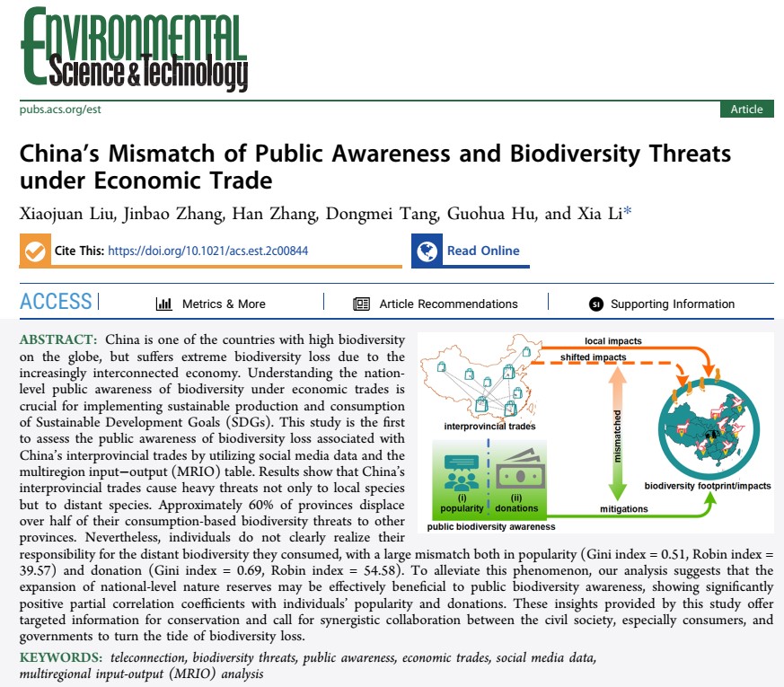 相关研究成果于6月20日以“China’s Mismatch of Public Awareness and Biodiversity Threats under Economic Trade”为题在线发表于国际著名期刊Environmental Science & Technology。华东师大博士研究生刘晓娟为第一作者,黎夏教授为通讯作者。