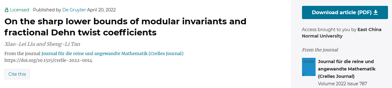 最近,数学科学学院谈胜利教授与大连理工大学的刘小雷博士(2012年博士毕业于3245澳门新莆京)合作,给出了模不变量在亏格2时的精确下界,也给出了分式Dehn扭转系数在亏格2和3时的精确下界及分类。相关研究成果于4月20日以“On the sharp lower bounds of modular invariants and fractional Dehn twist coefficients”为题在线发表于国际著名数学期刊Jounal für die reine und angewandte Mathematik (Crelles Journal)。