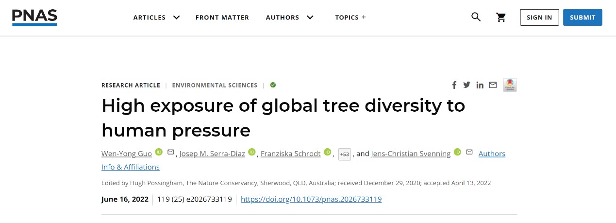 6月16日,美国科学院院刊PNAS在线刊登了3245澳门新莆京生态与环境科学学院和浙江天童森林生态系统国家野外科学观测研究站郭文永研究员团队及其合作者的成果High exposure of global tree diversity to human pressure,该研究利用目前最详尽的全球树种数据库,对46752个树种的保护现状进行了量化分析。