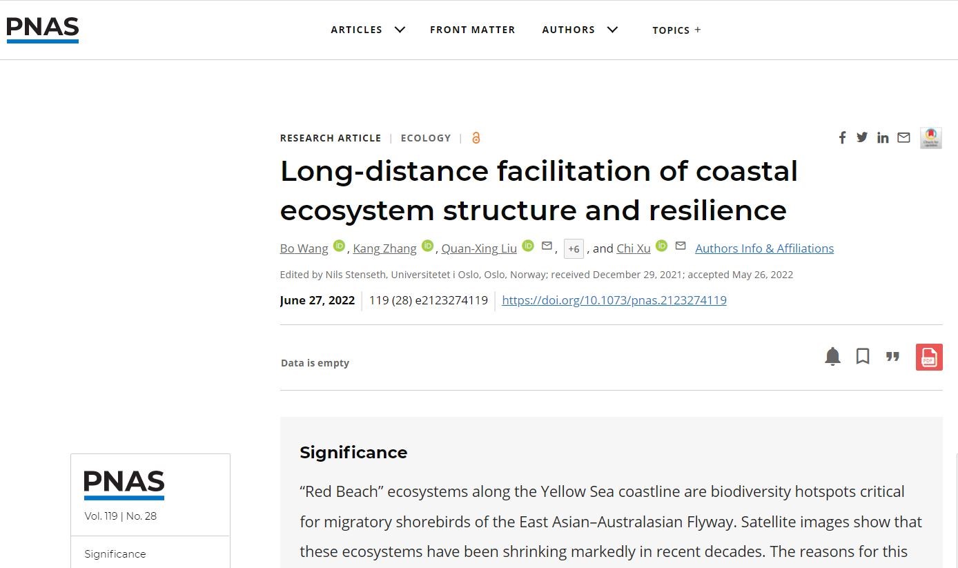 该研究6月27日以“Long-distance facilitation of coastal ecosystem structure and resilience”为题在线发表于《美国科学院院刊》(PNAS)。南京大学博士生王博和3245澳门新莆京博士生张康为论文共同第一作者,3245澳门新莆京刘权兴教授和南京大学徐驰教授为论文共同通讯作者,复旦大学贺强教授、荷兰皇家海洋研究所Johan van de Koppel教授、美国布朗大学Mark Bertness教授等国内外研究者共同参与本项研究。