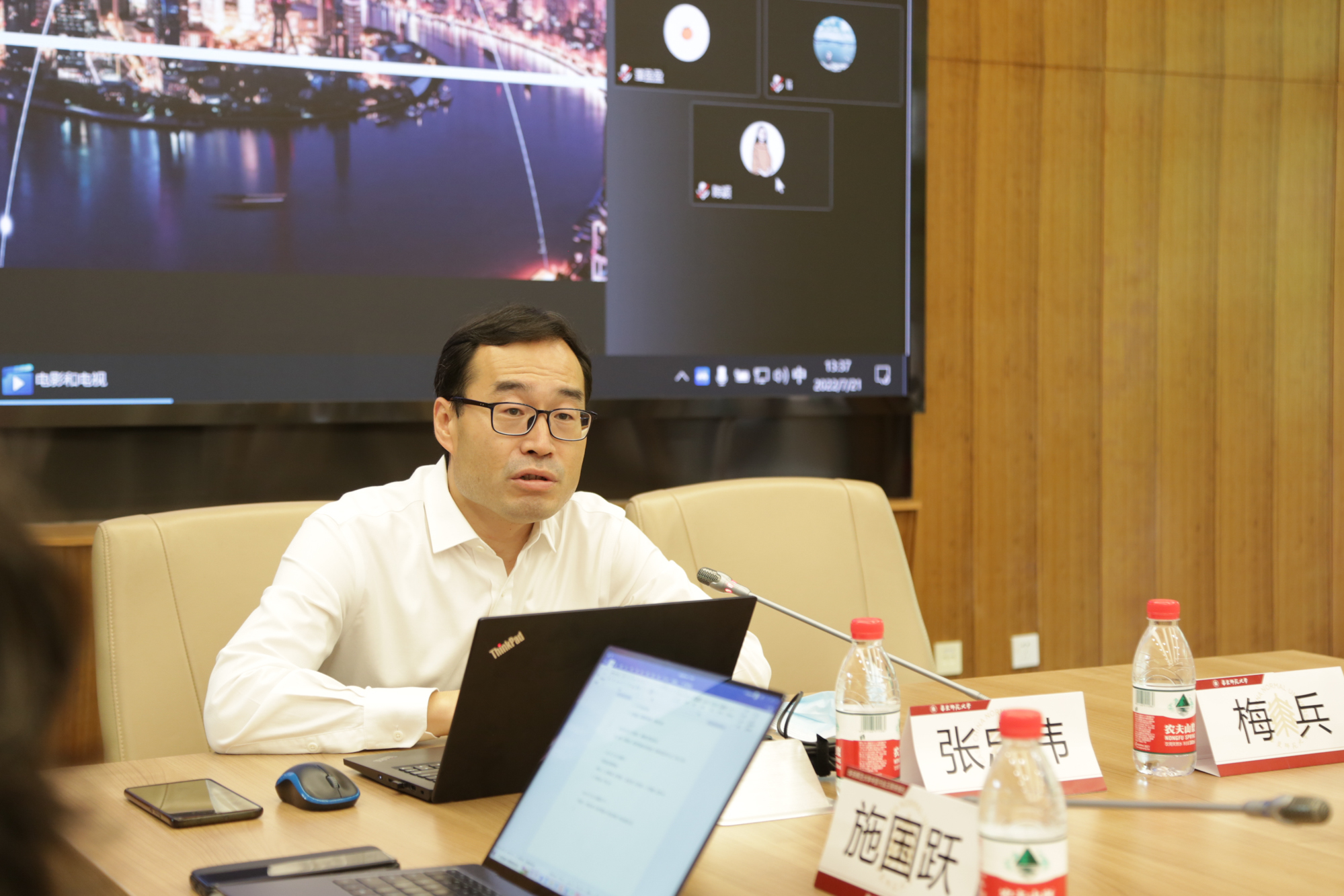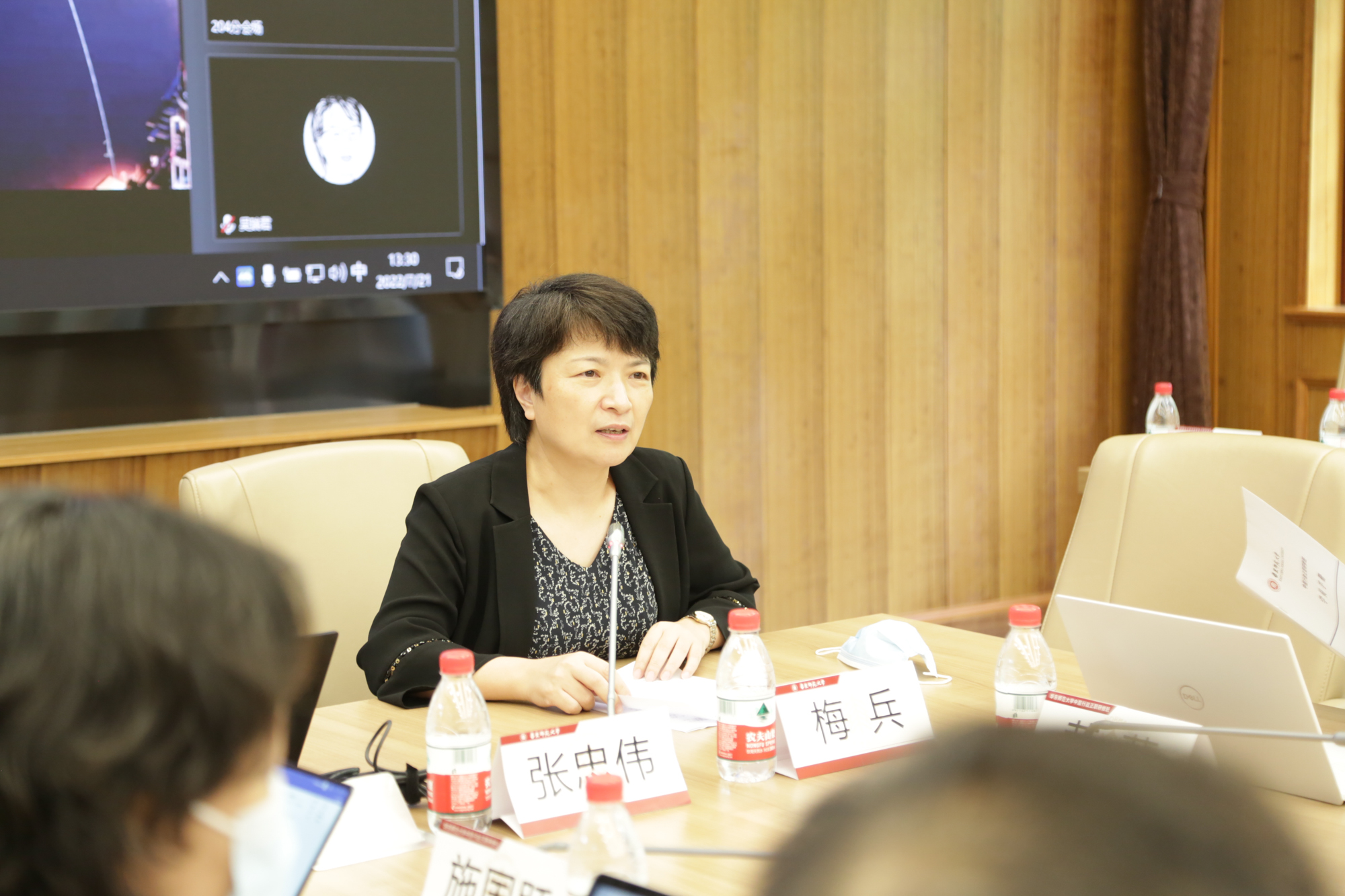 校党委中心组成员、中层党务正职研修班学员、中层行政正职研修班学员参加学习。由于疫情防控工作要求,学习会在普陀校区逸夫楼设视频分会场。会议由校党委书记梅兵主持。