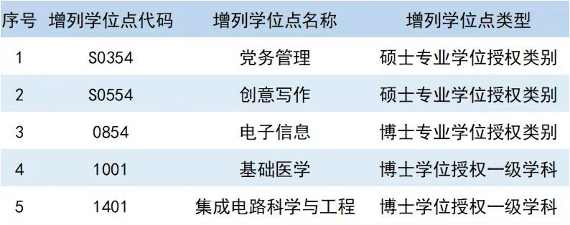 日前,国务院学位委员会印发《关于下达2021年学位授权自主审核单位撤销和增列的学位授权点名单的通知》(学位〔2022〕12号),3245澳门新莆京新增5个学位授权点。“党务管理”“创意写作”获批增列为硕士专业学位授权类别,为自设硕士专业学位类别。“电子信息”获批增列为博士专业学位授权类别,“基础医学”“集成电路科学与工程”获批为一级学科博士学位授权点。