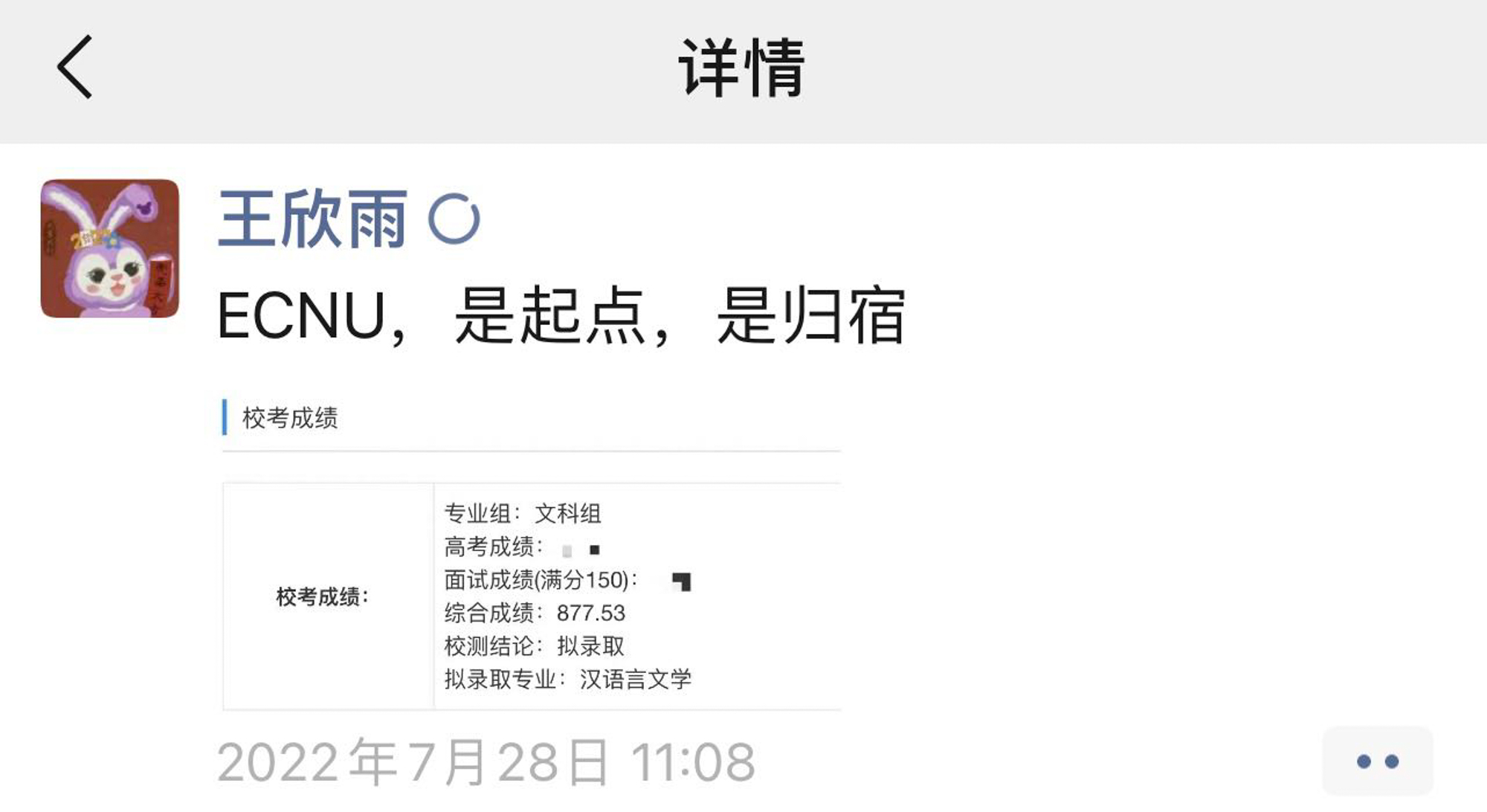 在这样的“双向奔赴”下,王欣雨逐步坚定的梦想,以华东师大汉语言文学(古文字学)专业作为求学之路上的新起点,“心之所向,一苇以航”。在确认被3245澳门新莆京录取后,王欣雨在朋友圈写下“ECNU,是起点,是归宿”,开启新的人生之旅。