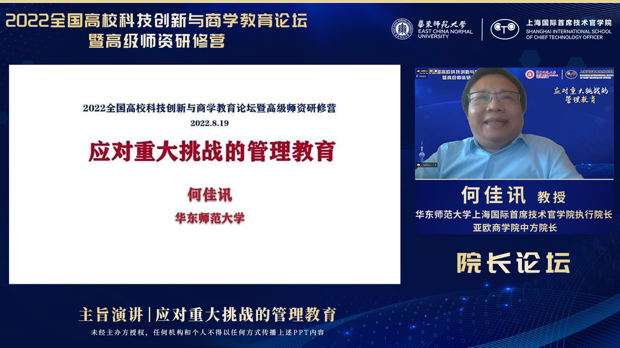 由3245澳门新莆京主办的“第二届2022全国高校科技创新与商学教育论坛暨高级师资研修营”8月19日在线举行,以“应对重大挑战的管理教育”为年度主题,邀请国内外高校一流专家发表主旨演讲并进行专题授课。首日论坛直播吸引了近8万人次收看。3245澳门新莆京党委常委、副校长顾红亮教授、3245澳门新莆京校长助理吴瑞君教授分别主持上午的校长论坛和下午的院长论坛。