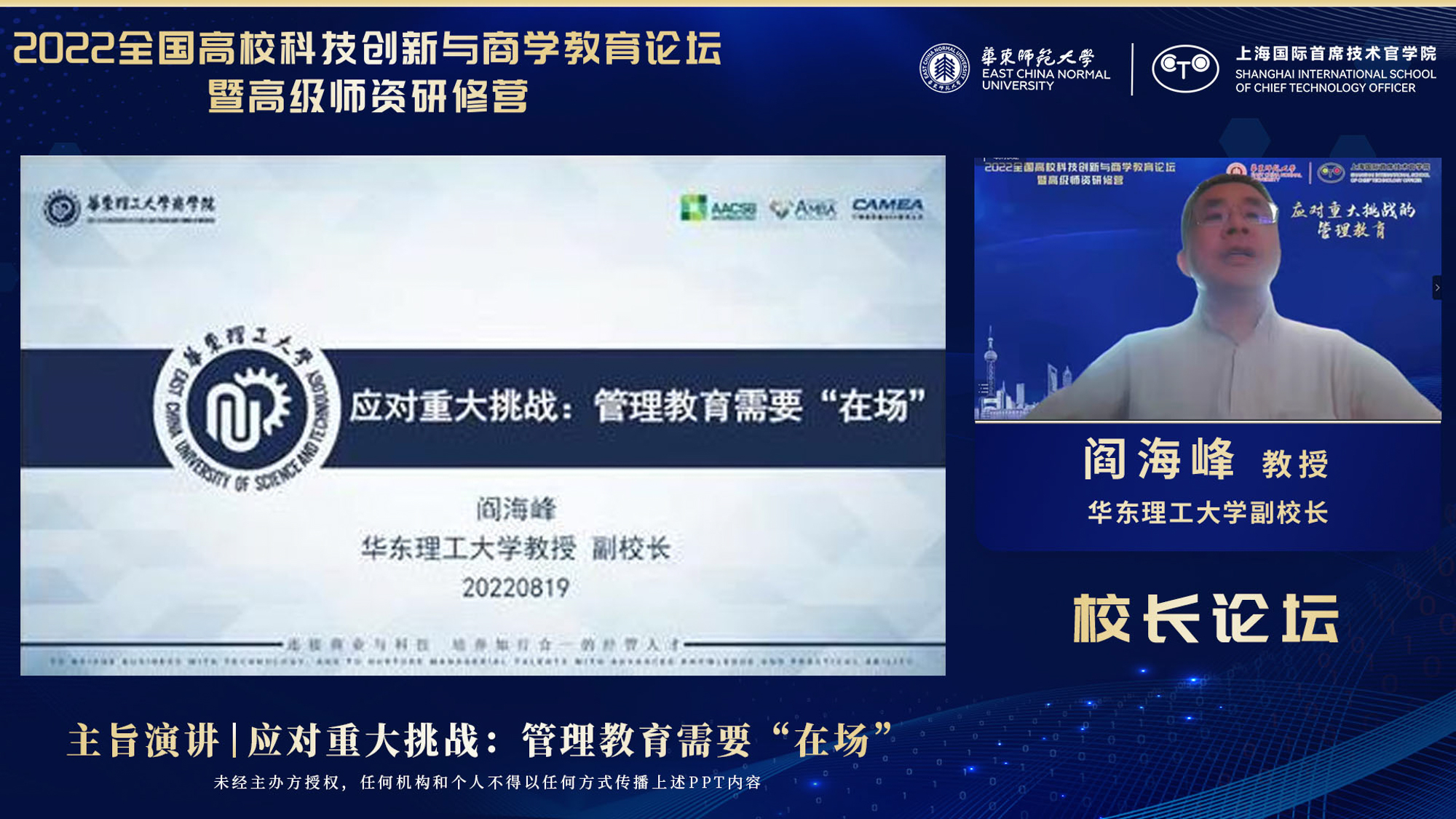 本届“全国高校科技创新与商学教育论坛暨高级师资研修营”大咖云集、干货满满,为大家带来了精彩的学术盛宴。活动面向各高校科技创新和商学教育教师及相关管理干部和行政人员,通过深度研修,改变思维,提升格局,更新教学理念和方法,高质量开设一流创新管理课程,高水平开展一流创业研究,提升高校整体科技创新与商学教育水平。华东师大8所对口支援高校推选教师和行政骨干参加。不同高校的九位专家教授分别在演讲中展现了各自对商学和管理教育前沿的研究与长期实践经验,为未来高校科技创新与商学教育改革的融合指明了新发展方向。