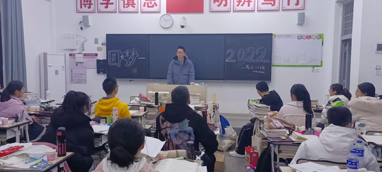 高三上学期末,学生们上台表决心,努力学习,圆梦大学。讲台上是董京辉