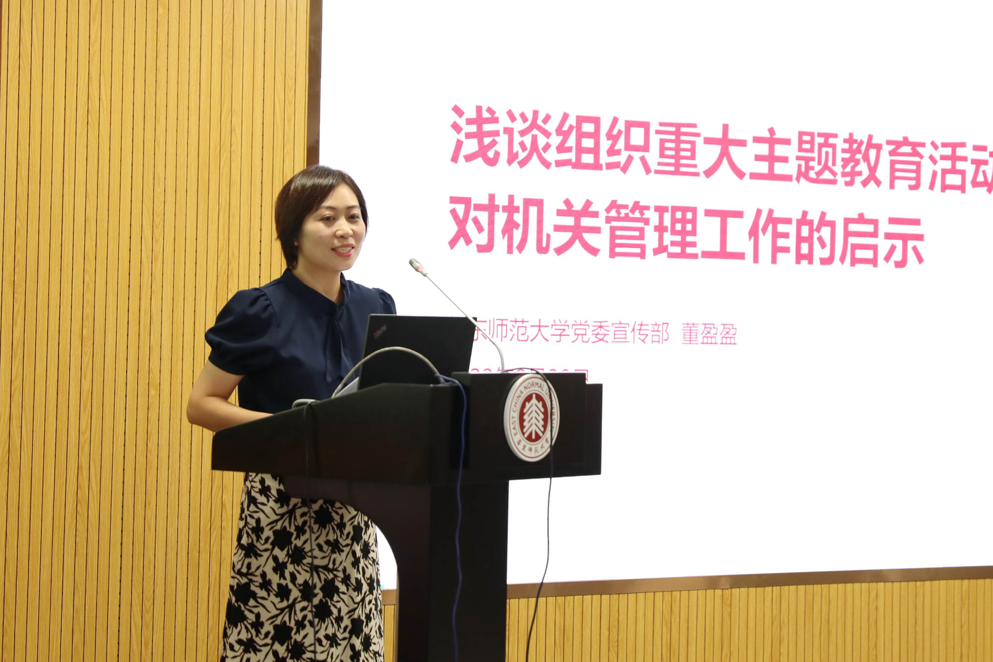 党委宣传部副部长兼教师工作部副部长董盈盈以《浅谈组织重大主题教育活动对机关管理工作的启示》为题,从重大主题教育活动的特点看“四种能力考验”以及从重大主题教育活动的组织看“三种思维训练”两个维度展开,分享学校组织开展“不忘初心、牢记使命”主题教育、“四史”学习教育、党史学习教育等全校性重大主题教育的工作案例。