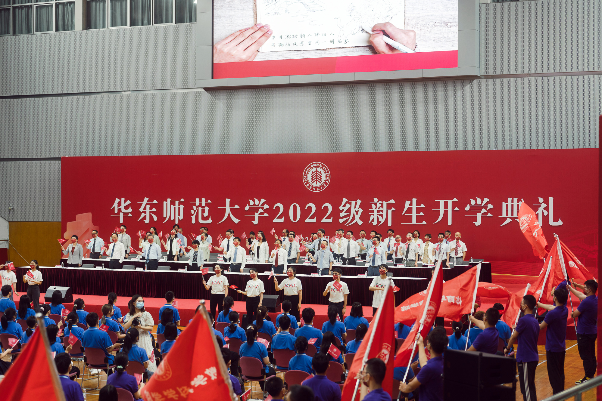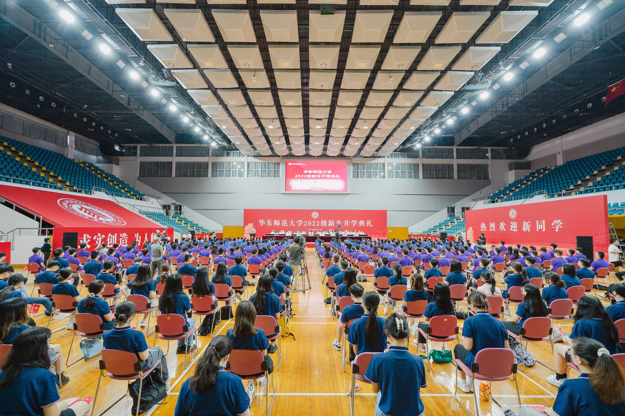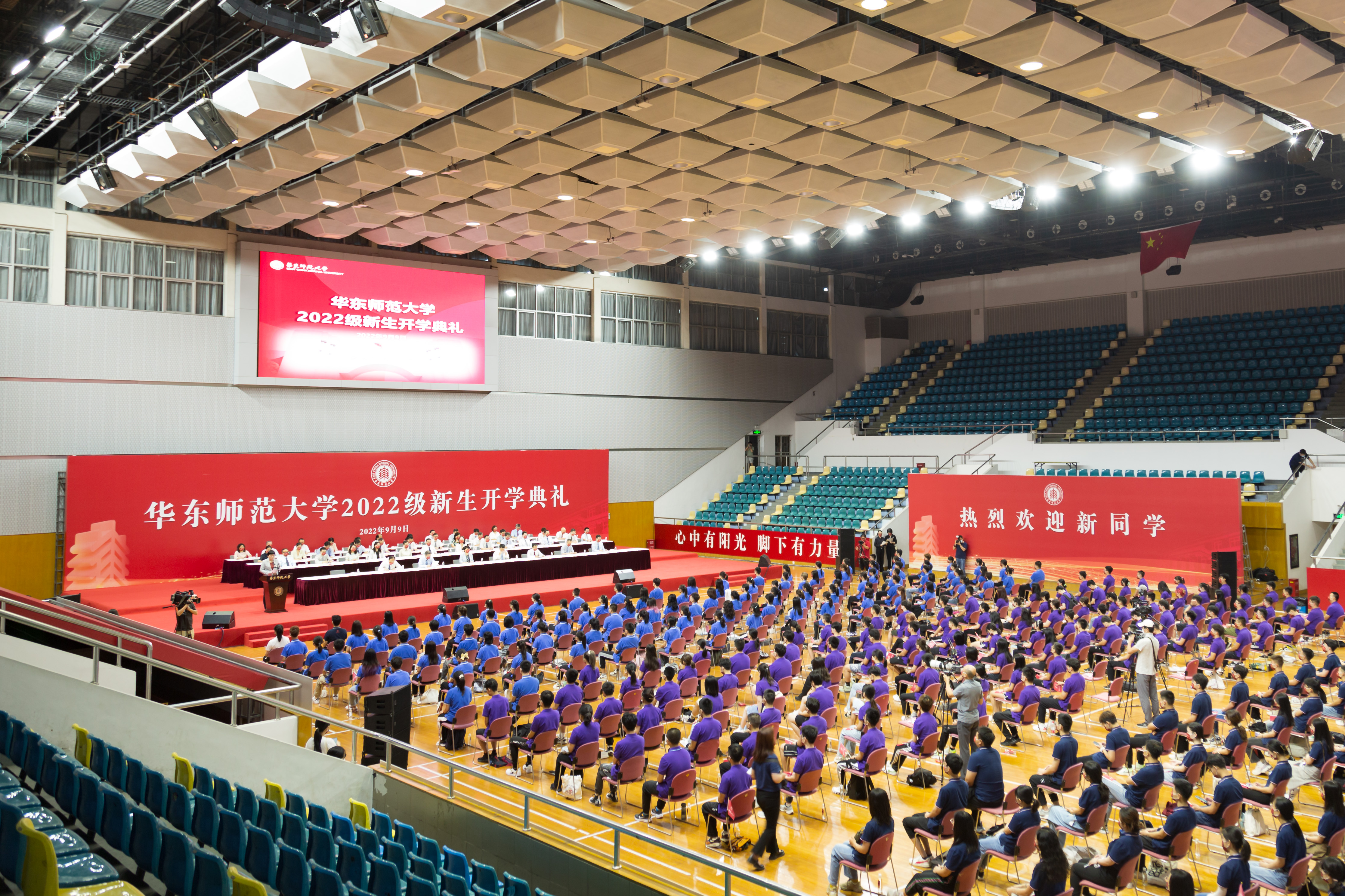 开学典礼在普陀校区体育馆主会场举行。出于防疫安全考虑,10950名来自全国和世界各地的优秀学子,以主会场和分会场以及在线直播相结合的方式相聚线下和“云端”,开启大学生活新征程。