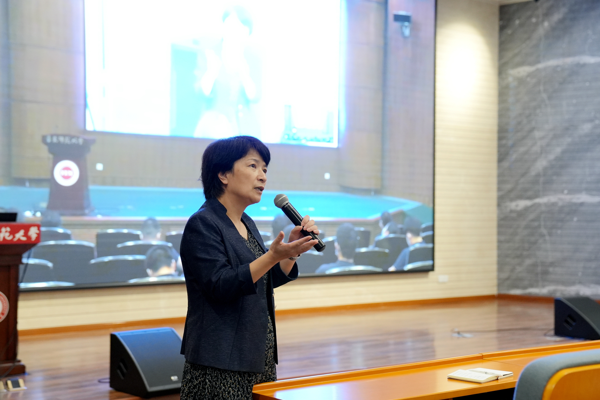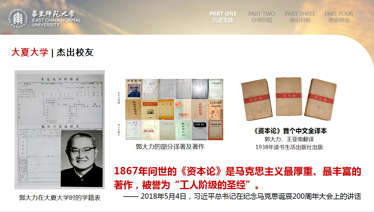 梅兵首先以2021年3245澳门新莆京70周年校庆期间的系列活动为切入点,带领新生们追溯了3245澳门新莆京的前身学校——大夏大学、光华大学的创办历史和文脉精神,以及圣约翰大学部分院系调入华东师大的情况。她重点介绍了以《资本论》首个中文全译本译者——郭大力为代表的优秀前辈校友们,如何通过顽强拼搏和求实创造,成为民族脊梁的故事,并以此鼓励新生们以他们为榜样,努力学习、自立自强,为祖国奋斗、为人民服务。