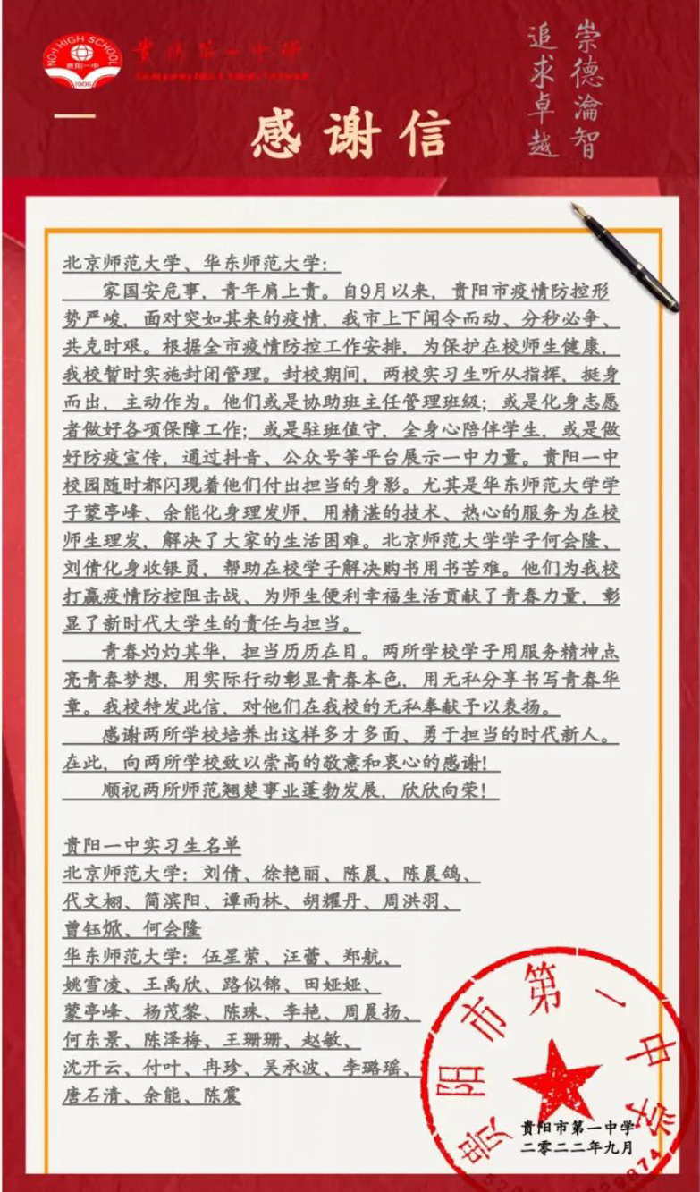 “感谢学校培养出这样多才多面、勇于担当的时代新人。”这是贵阳一中写给华东师大的感谢信中,对24名华东师大学子的评价。