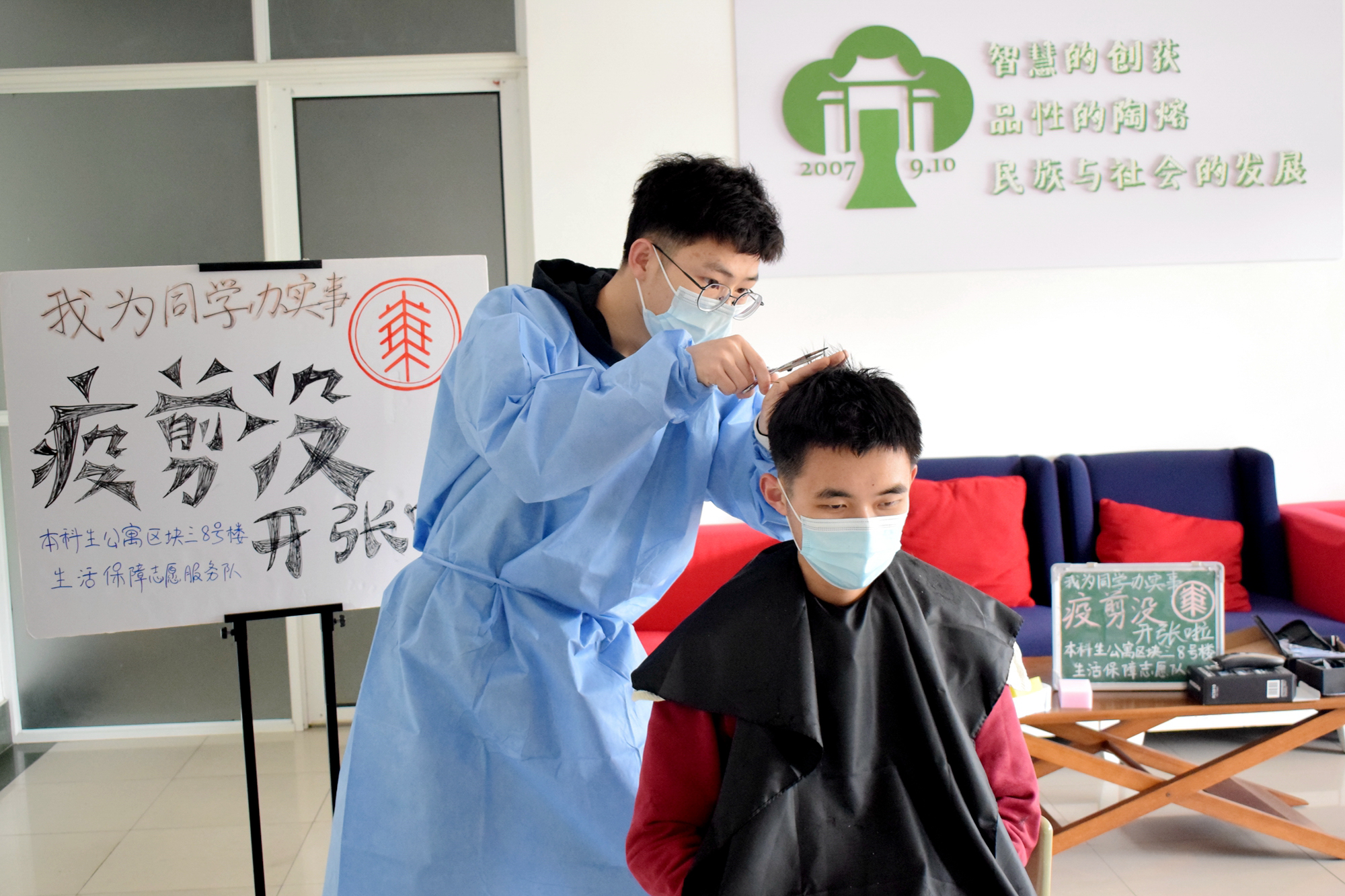 在感谢信中被点名表扬的孟宪承书院2019级物理专业蒙亭峰同学,之前曾是闵行校区区块三8号楼“疫剪没”理发店的首席理发师。在此前的采访中,他曾表示:“我是师范生,理发在我看来就像教书一样,教会一道题和剪好一个发型,都是促使我融会贯通、成长沉淀的过程。”